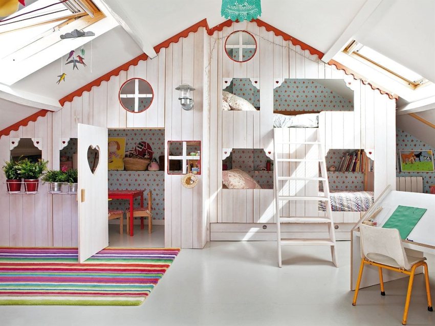 Una habitació per a nens sota el terrat és original i inusual, i el més important és que permet al nen trobar-se en un món de contes de fades que només li pertany. L’interior de les habitacions de les golfes per a nens no està limitat per prohibicions i normes. Aquí es poden realitzar les fantasies més inesperades. L’habitació es pot convertir en una cabina de vaixell pirata o una nau espacial per a un nen i un castell de princeses de conte de fades per a una nena. Les fotos dels interiors del pis de les golfes, dissenyades per a habitacions infantils, inspiraran experiments creatius.
