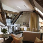 La peculiaritat de l’habitació sota el terrat són les parets inclinades. També són el principal problema a l’hora de triar un disseny, ja que les solucions estàndard no funcionaran aquí. També en el disseny, cal tenir en compte els sostres baixos, els detalls del sostre, la ubicació de les escales. Per tant, abans de començar a treballar a les golfes, cal pensar tots els detalls fins al més mínim detall. Al cap i a la fi, l’interior de les golfes depèn de la disposició del pis superior i de la forma del sostre.