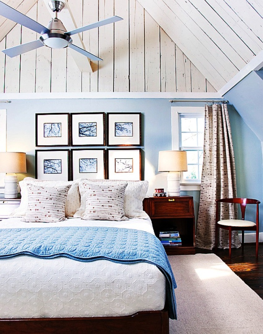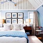 Els colors clars i pastel són ideals per a una habitació sota un sostre. Els amants dels colors vius els poden aplicar en diversos detalls.Massa colors variats pressionaran els inquilins, però una habitació completament blanca tampoc no és la millor opció. Combina de manera òptima el blanc amb el cafè, els tons sorrencs i blaus. Podeu comprovar-ho mirant la foto del disseny de les golfes.