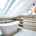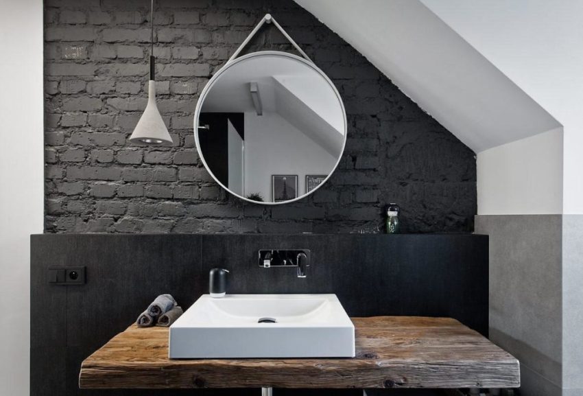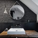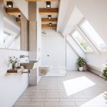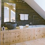 Tots els mobles de bany de les golfes han de ser compactes. És millor utilitzar lavabos incorporats als armaris i armaris penjants. La superfície d’aquests mobles ha de ser clara, brillant o amb miralls. Això farà que l’habitació sigui visualment més àmplia. Si l’habitació és bastant àmplia, el disseny de les parets i del terra pot ser qualsevol.