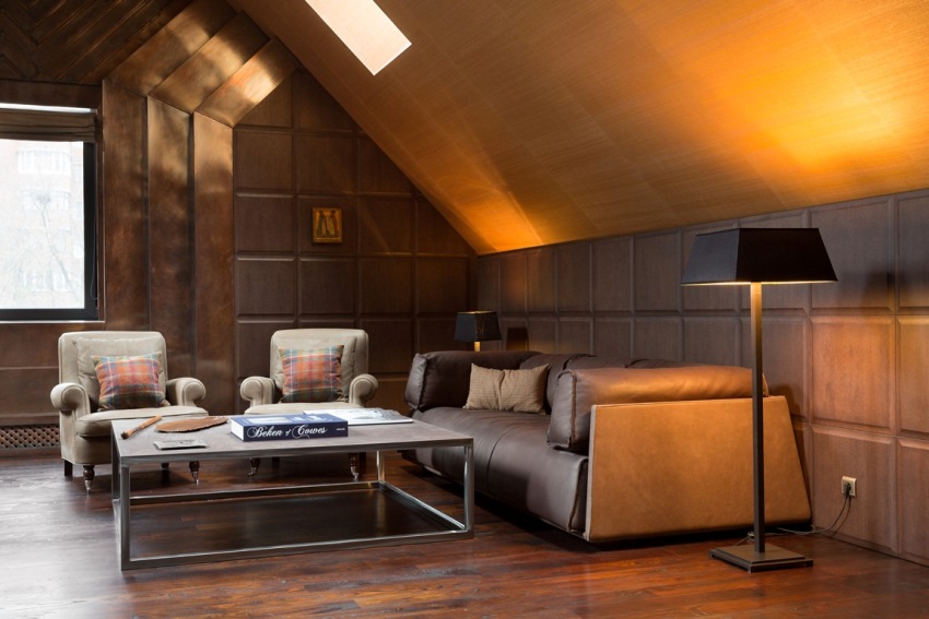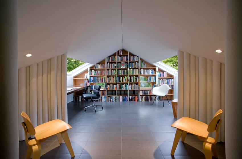 - 11 Decoració d’un estudi, biblioteca o cinema sota el sostre de les golfes: foto