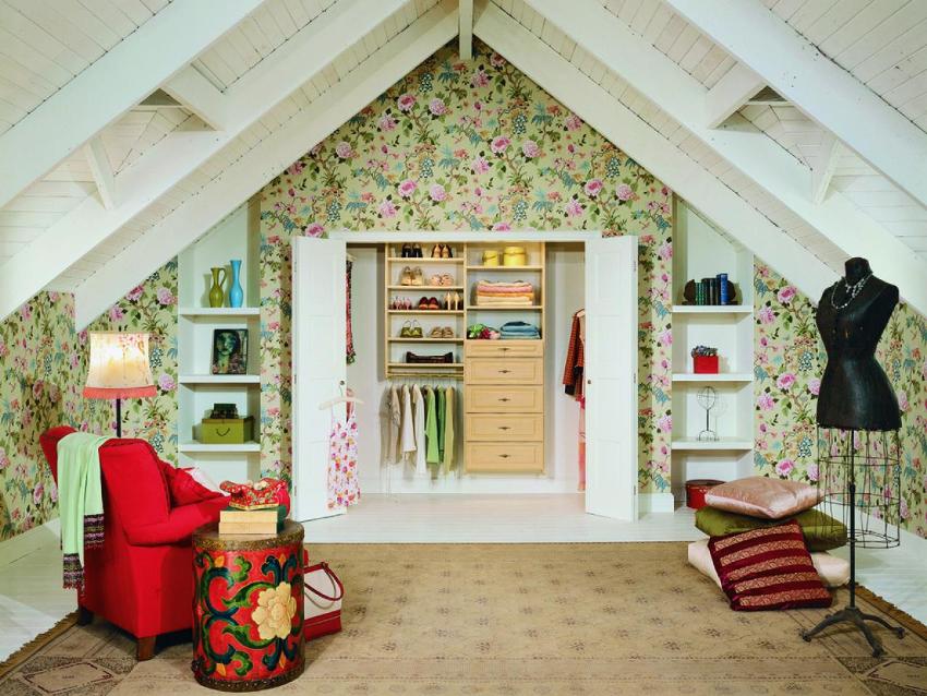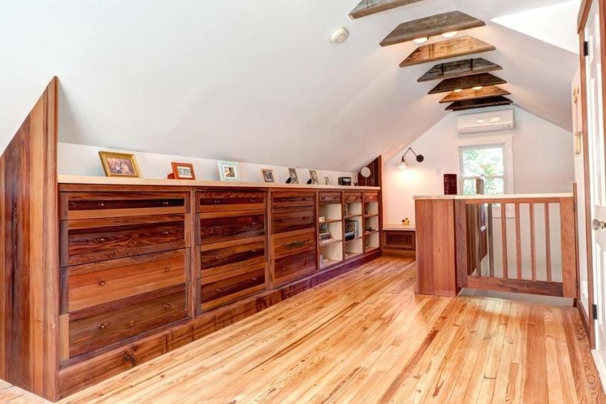 En qualsevol cas, és necessari emmagatzemar les coses a les golfes i encabir harmoniosament un armari rectangular a l’interior és una tasca problemàtica. Podeu resoldre aquest problema donant preferència als mobles fets a mida. Un fabricant de mobles experimentat crearà una peça que s’adapti perfectament a la configuració de l’habitació. Per inspirar-vos, podeu veure una foto del disseny interior de les golfes amb mobles casolans i creatius.