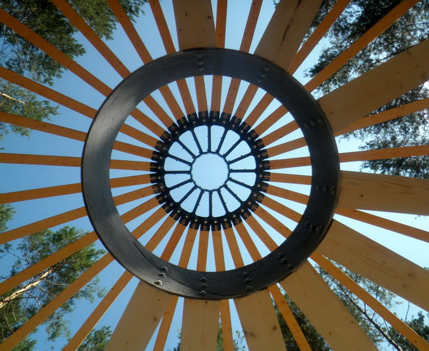 Al punt superior, on convergeixen tots els feixos, s’utilitza un disc especial per a una fixació fiable. Al mateix temps, es realitza el revestiment dels segments inferiors, cosa que proporciona a l'estructura una estabilitat i resistència addicionals. Després d’això, només queda instal·lar els puntals superiors i revestir el marc amb taulers de fusta.