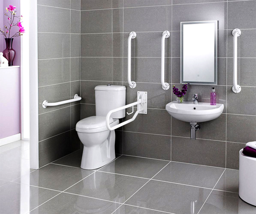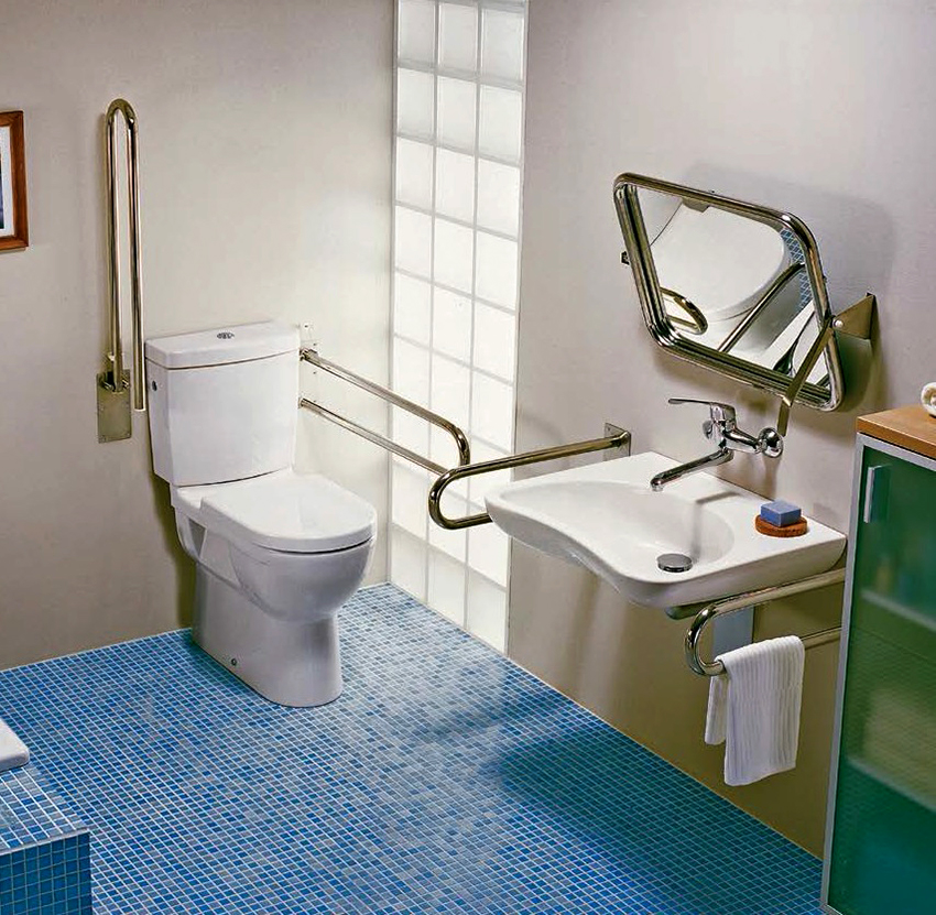 En un lavabo destinat a una persona amb discapacitat, l’aigüera s’ha d’instal·lar a un nivell no superior a 80 cm i el mirall a una alçada d’1 m. usuari de cadira de rodes. El botó de desguàs també s’ha de muntar a una alçada convenient, el millor és que estigui situat en un dels passamans.