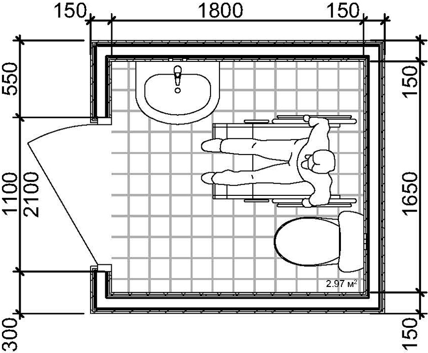 Les dimensions mínimes d’un vàter per a persones amb discapacitat: profunditat - 180 cm, amplada - 165 cm