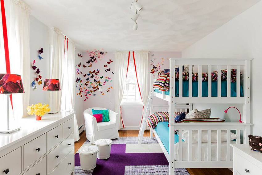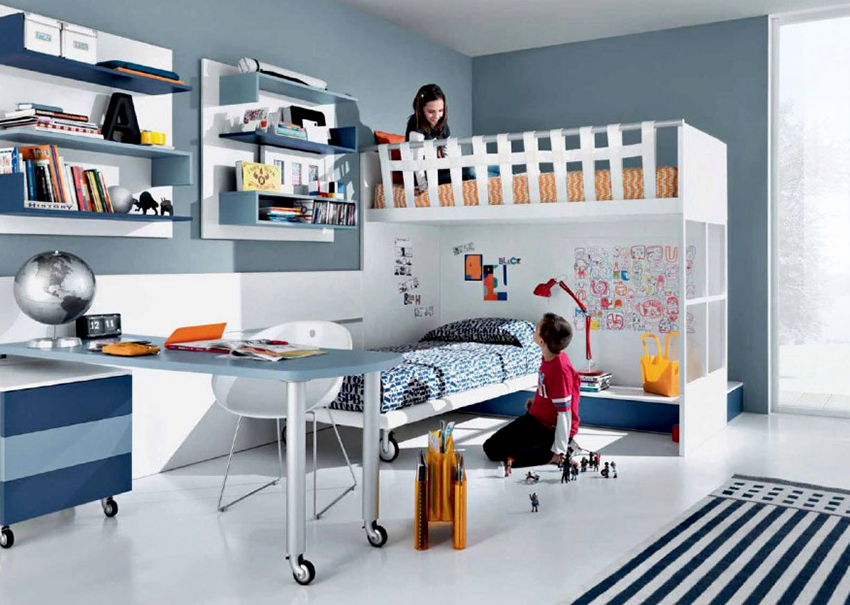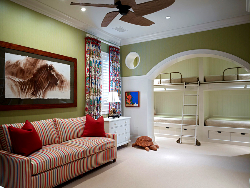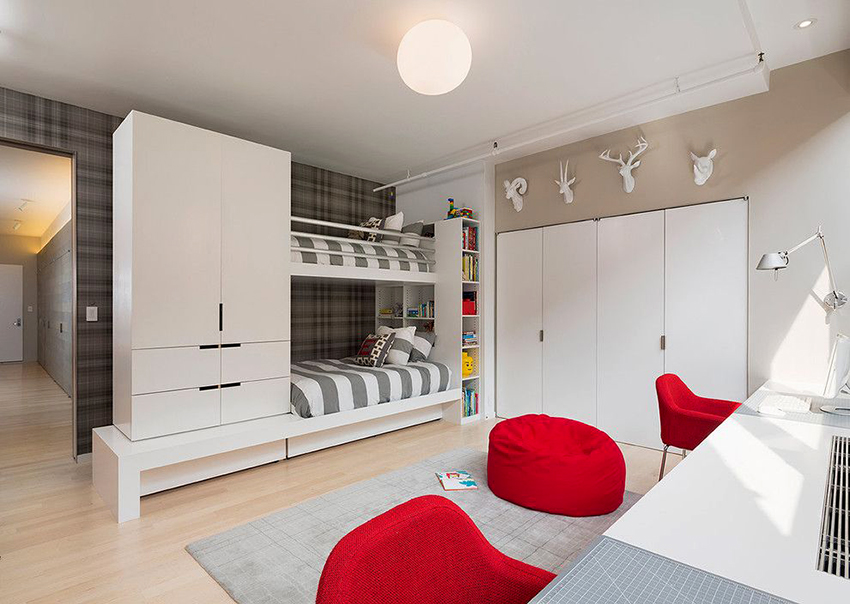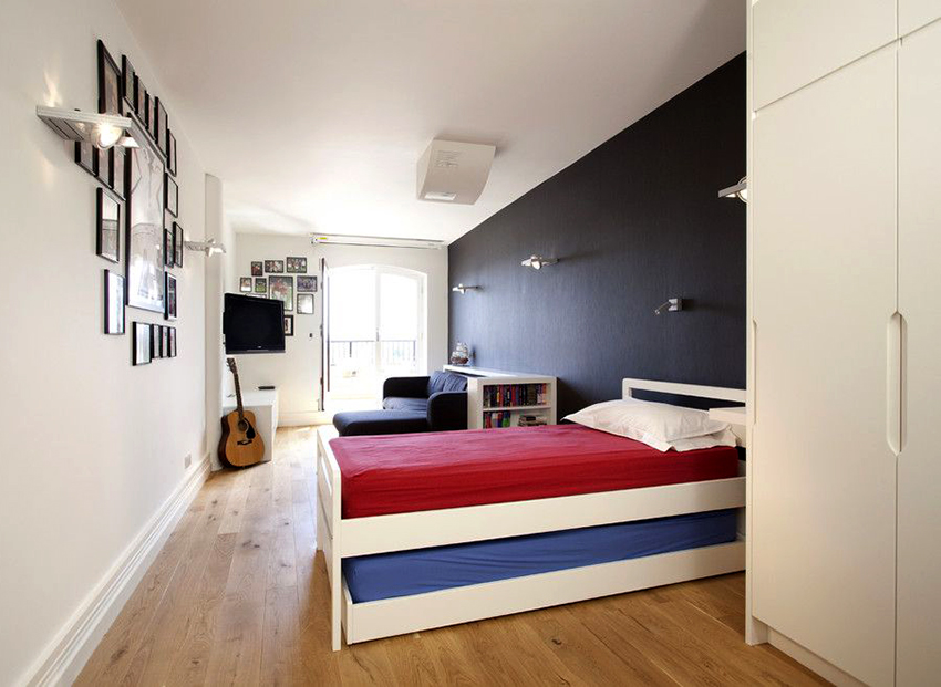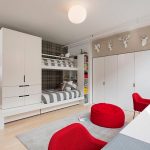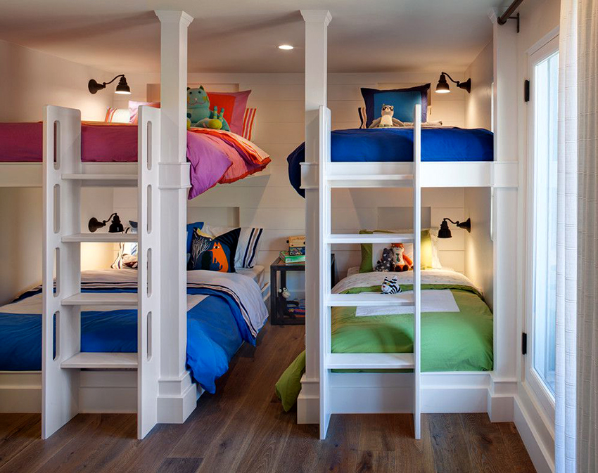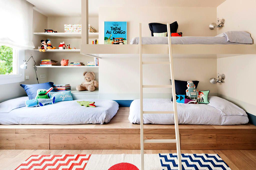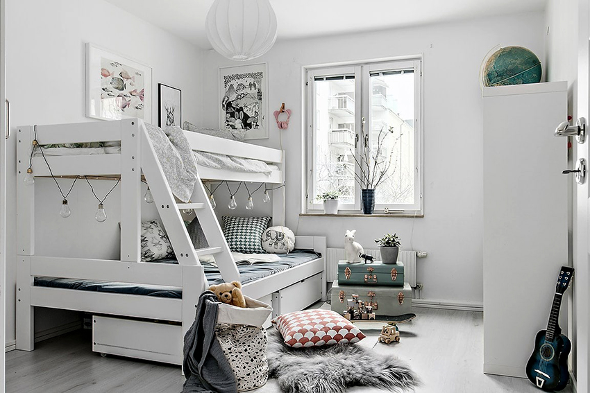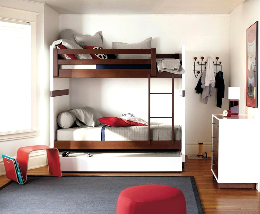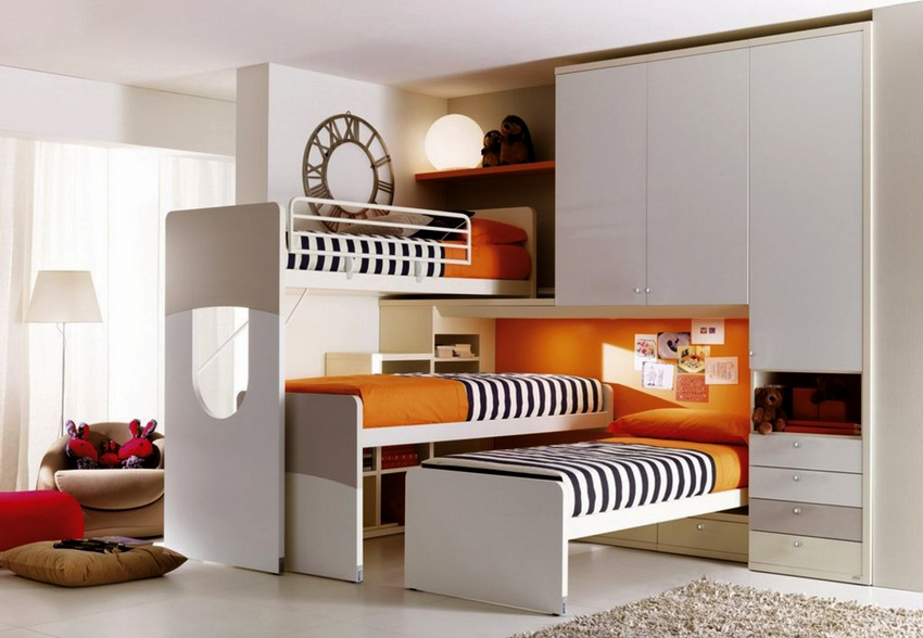 Pro tři děti lze oddělit lůžka kolmo na sebe. Taková zajímavá možnost je přijatelná pro pokoje s vysokými stropy.