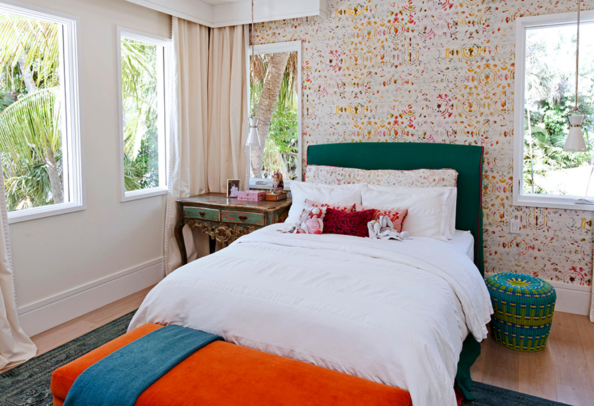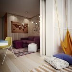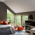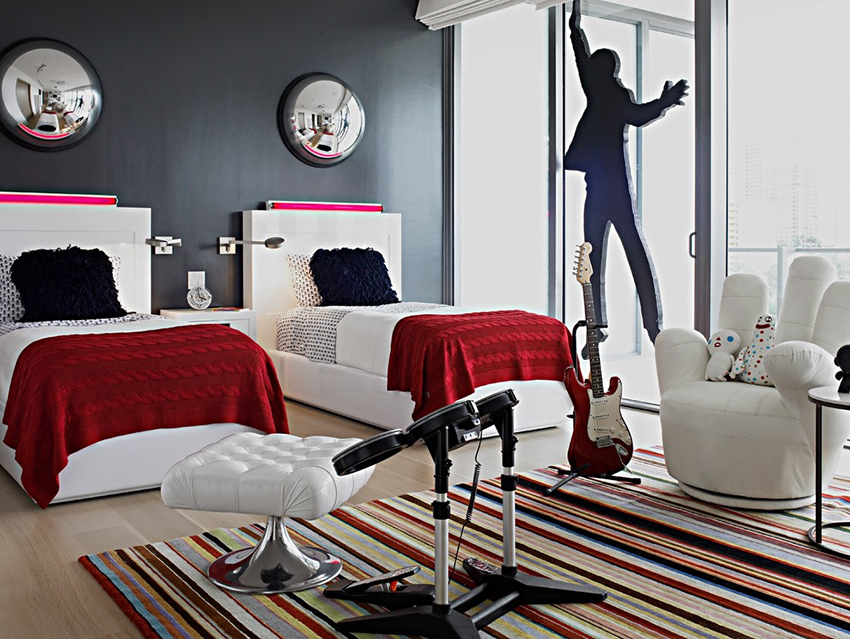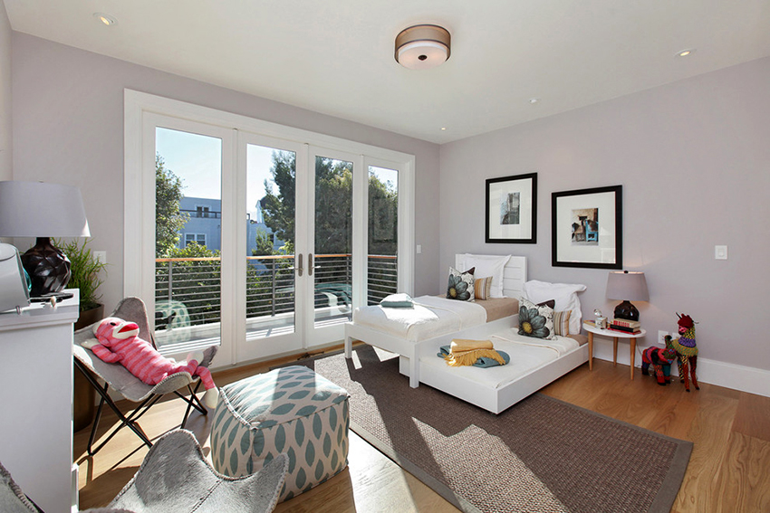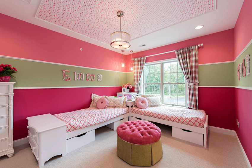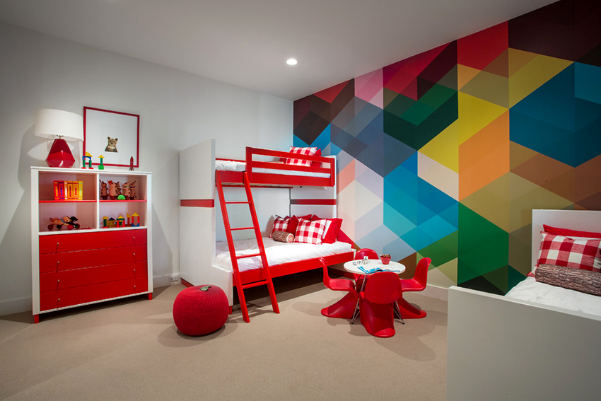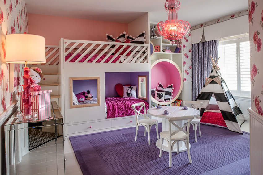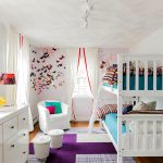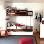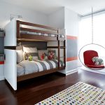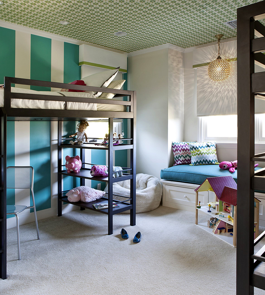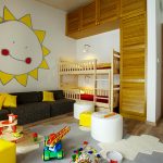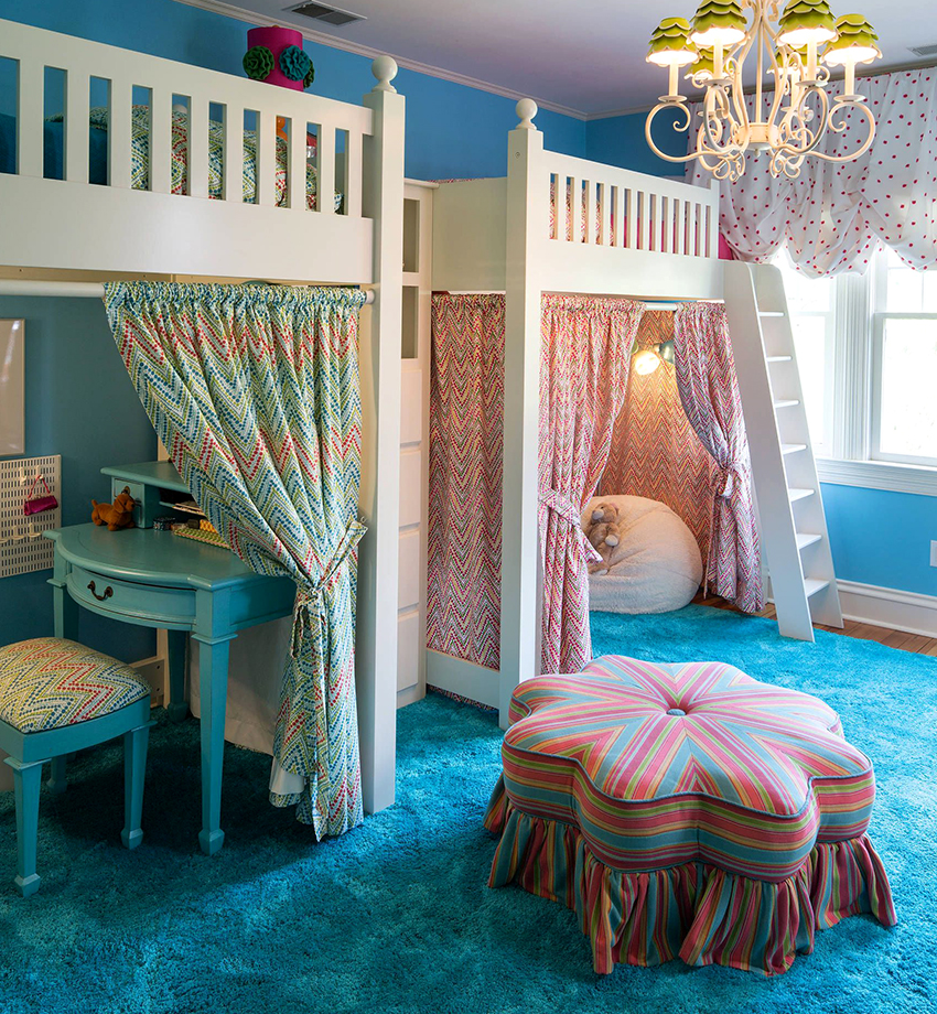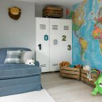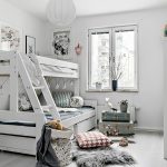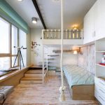 Pro tři děti lze oddělit lůžka kolmo na sebe. Taková zajímavá možnost je přijatelná pro pokoje s vysokými stropy.