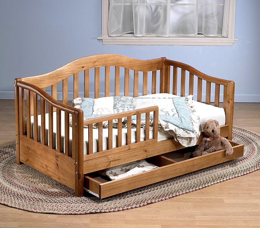 Zásuvky mohou být umístěny dole nebo na boku. Druhou možnost představuje obrubník, který je pomocí pevného uchycení spojen s rámem postele. Některé modely dřevěných dětských postelí mají skládací noční stolek, který se přemění na malý stolek. Existují kombinované možnosti, ve kterých jsou boxy umístěny pod lůžkem a na jeho boční straně. Takové modely se vyznačují maximální funkčností.