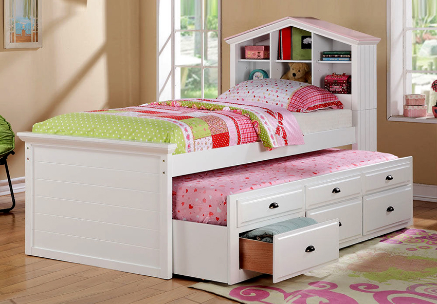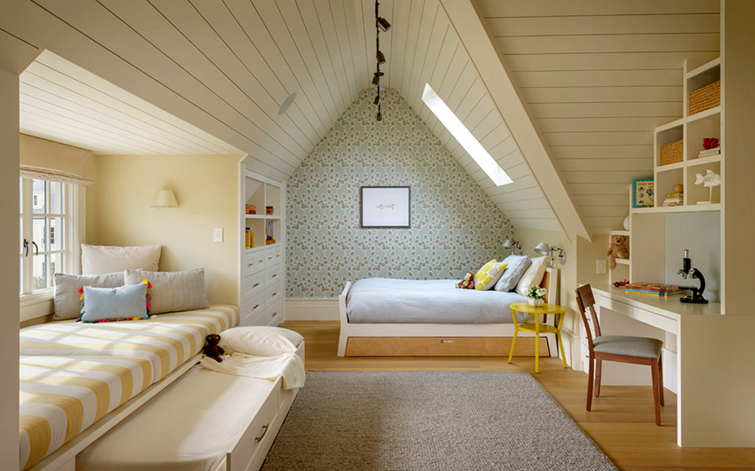 Podkrovní postel je mezi rodiči velmi oblíbená, protože design lze použít pro děti od 3 do 14 let. Tento model šetří místo. Skládá se z dětské postele s bočnicemi, která je umístěna na druhém patře, a kusů nábytku v podobě komody, polic, zásuvek a stolu v prvním patře. Různé modely mohou být vybaveny různými samostatnými prvky.