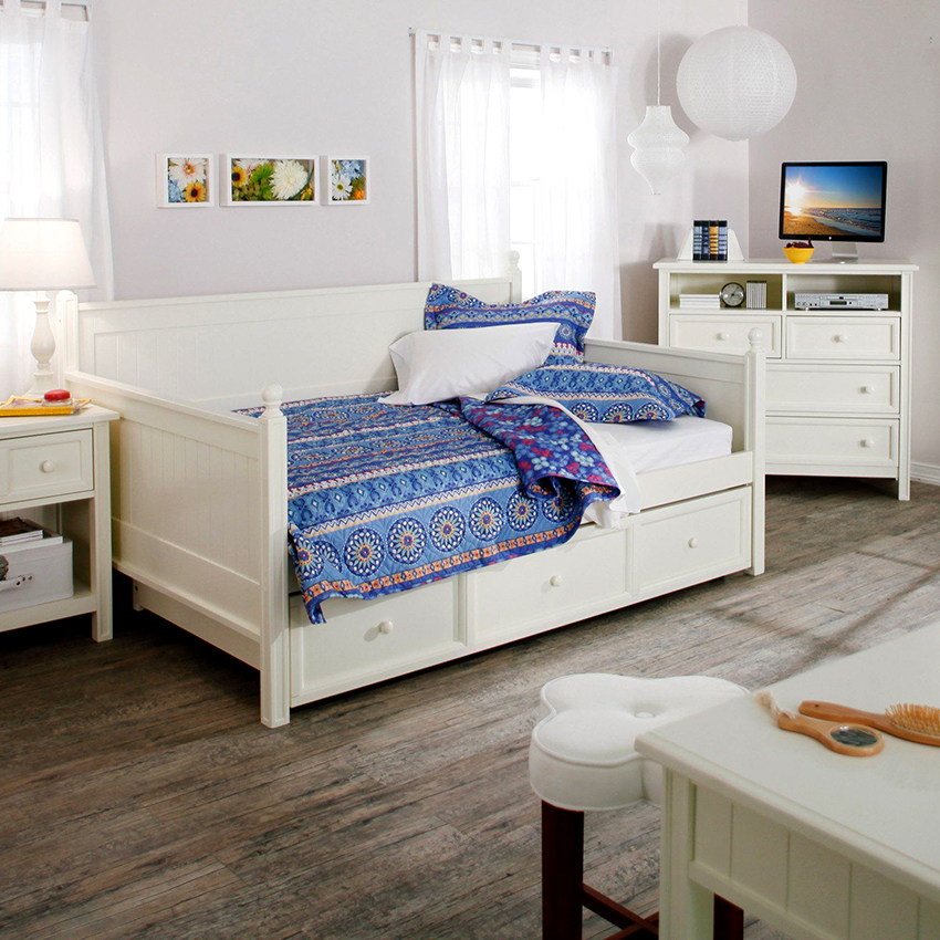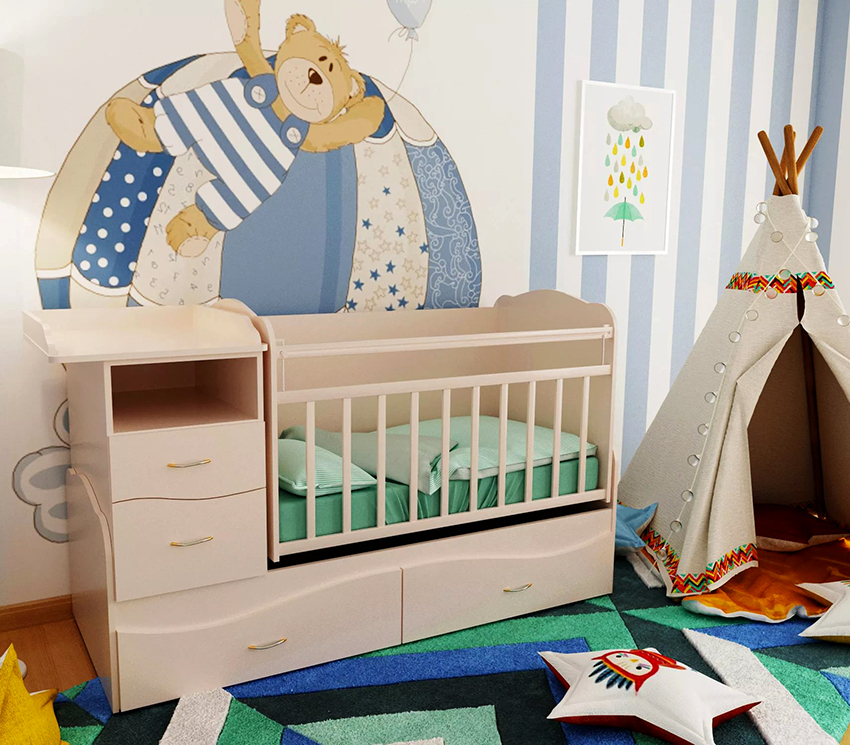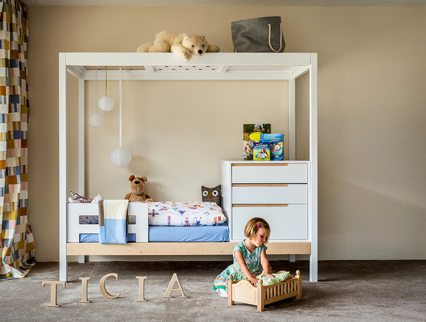 Komoda je vhodná pro umístění ložního prádla a oblečení. Doporučuje se naplnit zásuvky příslušenstvím určeným pro kreativitu a studium. Police mohou obsahovat hračky, knihy, fotografie a další předměty, které dítě potřebuje. Důležitým a nezbytným prvkem je výsuvný stůl, který využije jak dítě předškolního věku, tak školák.