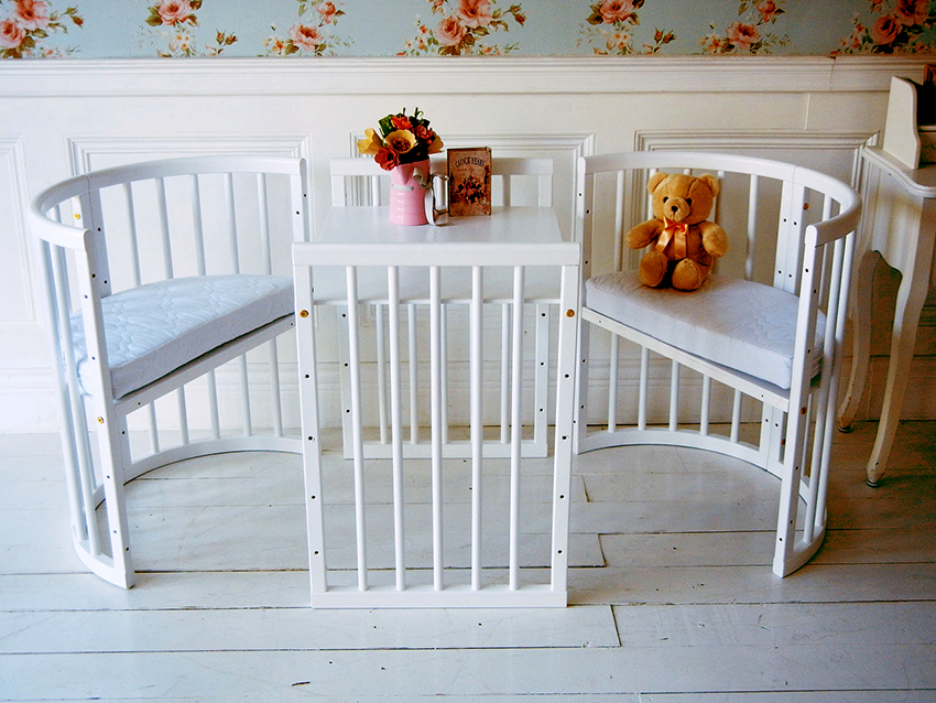 Velmi oblíbenou možností je dětská neobvyklá kulatá transformační postel.Konstrukce je vyrobena z tenkých plastových tyčí, takže v ní nejsou žádné ostré rohy. Jak dítě vyroste, změní se na oválnou postel. Toho se dosáhne kombinací kulaté struktury a přebalovacího stolu obsaženého v této sadě.