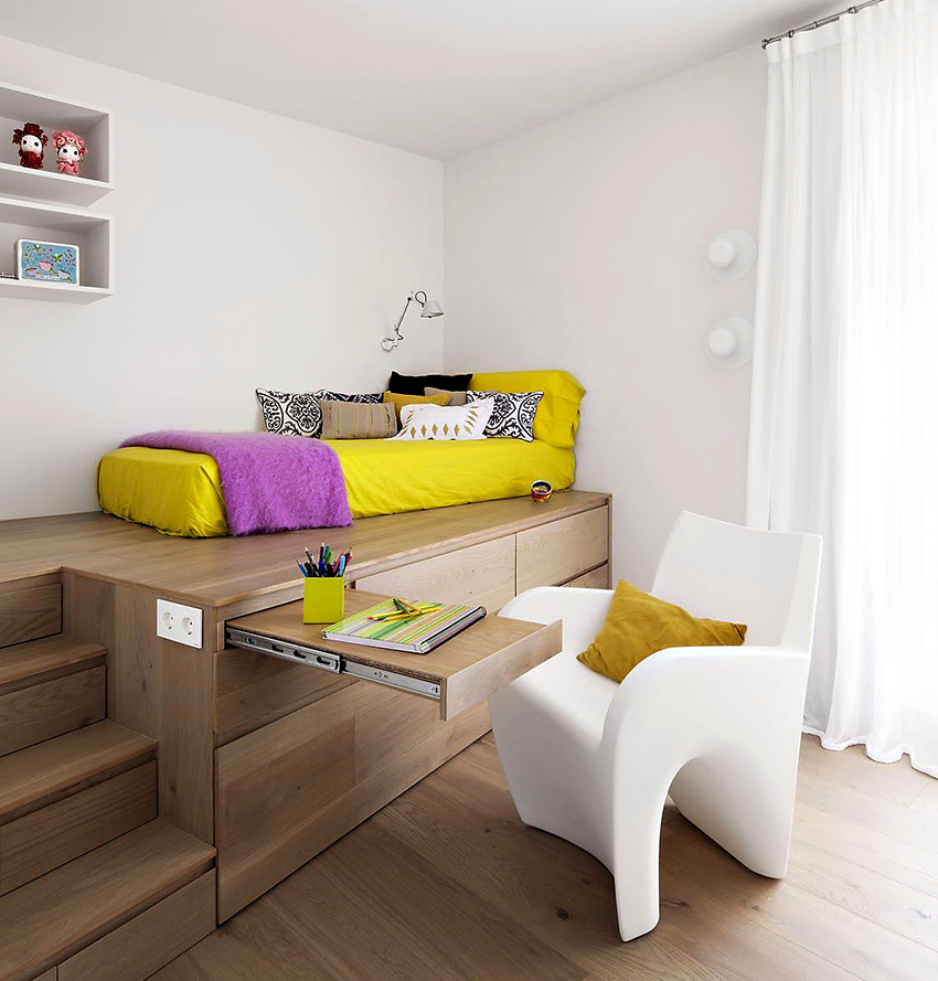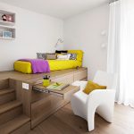 Dalším typem transformační postele je design s pódiem, ve kterém je produkt umístěn. Taková výsuvná dětská postýlka vám umožní získat více volného prostoru pro uspořádání hřiště nebo pracovního prostoru. Kotviště lze také umístit na pódium a na jeho základně je uspořádán pohodlný úložný systém.
