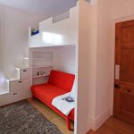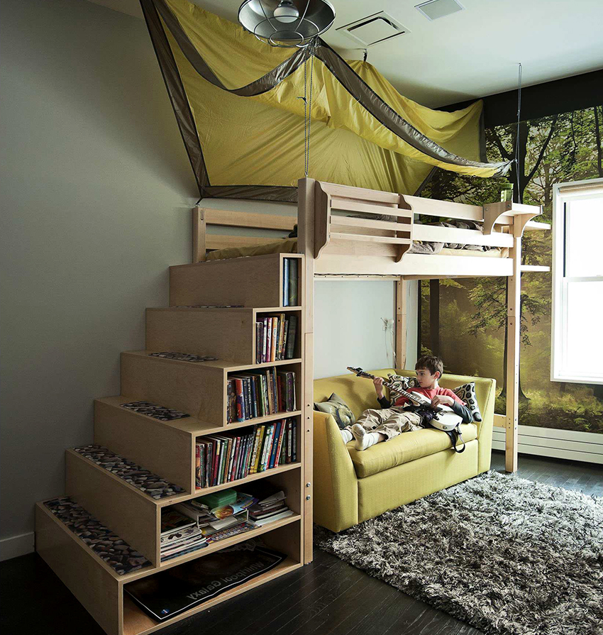 Ke vstupu do druhého patra je loftová postel vybavena žebříkem a může být umístěna kdekoli v konstrukci. Výsuvné schodiště se zásuvkou pod každým schodem je velmi populární (kvůli vysoké funkčnosti produktu).