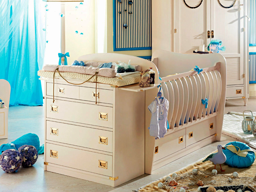 Dětská transformační postel (fotografie jasně ukazují její různé typy) má modulární design. Model pro novorozence se skládá ze samostatných prvků v podobě postele, přebalovacího pultu, komody a police na hračky. S růstem dítěte lze tento multifunkční modul přeměnit na prostornější místo na spaní díky odnímatelným bočnicím a sklopnému dnu. Tato možnost je nejekonomičtější a nejracionálnější.