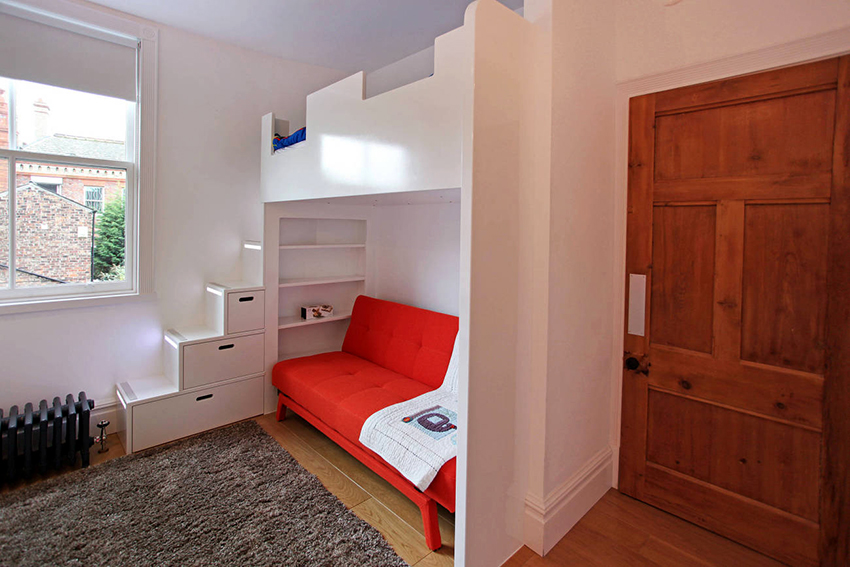 Poschodové postele-pohovky vypadají neobvykle a funkčně. Tento design lze použít pro tři děti. Dvě děti stejného pohlaví budou spát na gauči umístěném na nižší úrovni, zatímco třetí obsadí horní patro. Je to také dobré řešení pro rodiny s dítětem, které žijí v jednopokojovém bytě. V tomto případě mohou rodiče spát na pohovce v přízemí a dítě na posteli v patře.