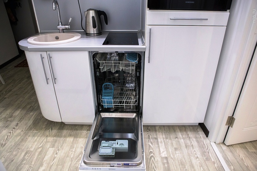 Oftest placeres en lille opvaskemaskine et reserveret sted i køkkenenheden. Bedre hvis det er i nærheden af vasken. Denne position har følgende fordele:
