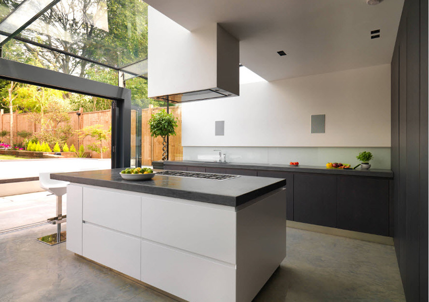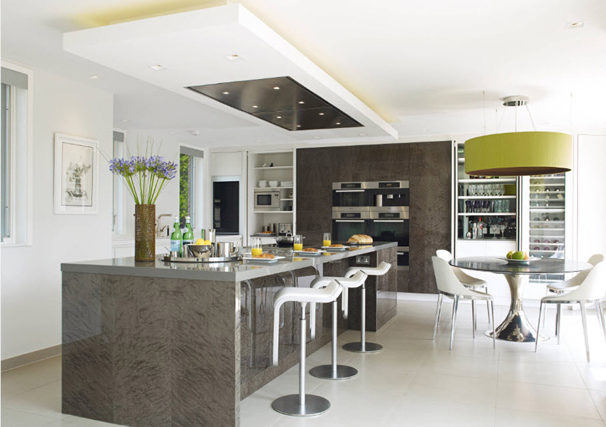 Den integrerede udstødningsenhed ser harmonisk ud i køkkenets interiør. Afhængig af placeringsfunktionerne skelnes vandrette og lodrette enheder. Ud over selve emhætten kan dræningselementer også skjules i overskabe, som, når de placeres udenfor, ødelægger køkkenets udseende.
