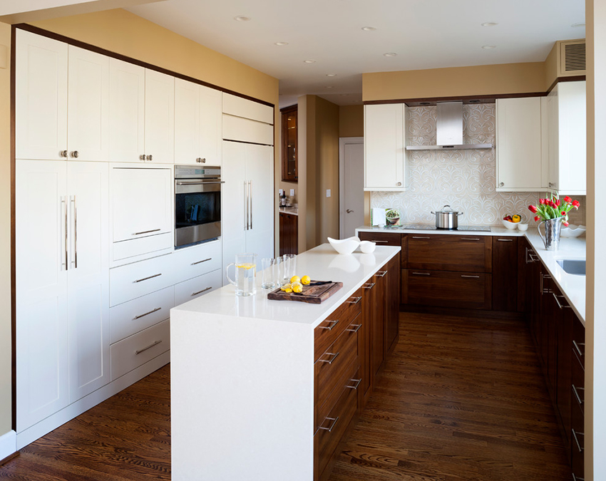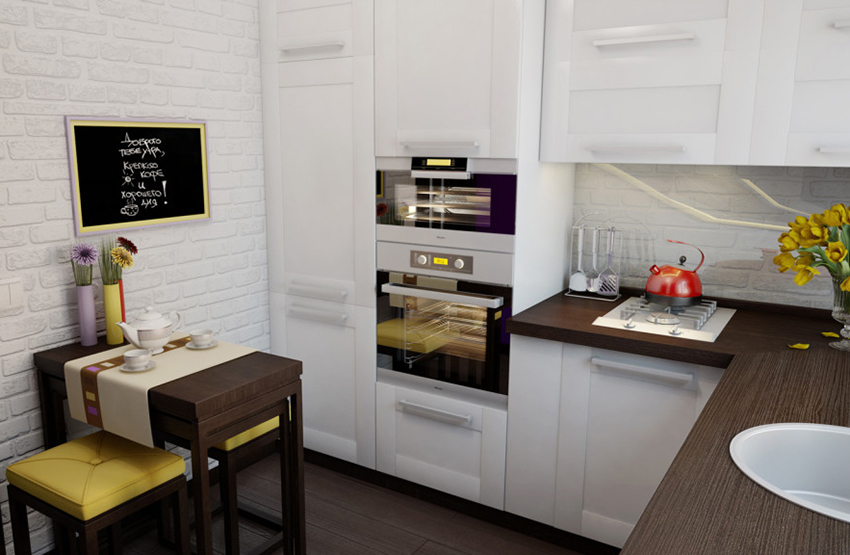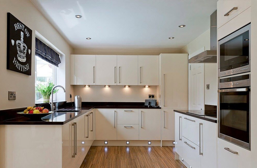 Billeder af interessante muligheder for det indbyggede køkken. Fordele og ulemper ved møbler. Korrekt udstyr og stil i rummet.