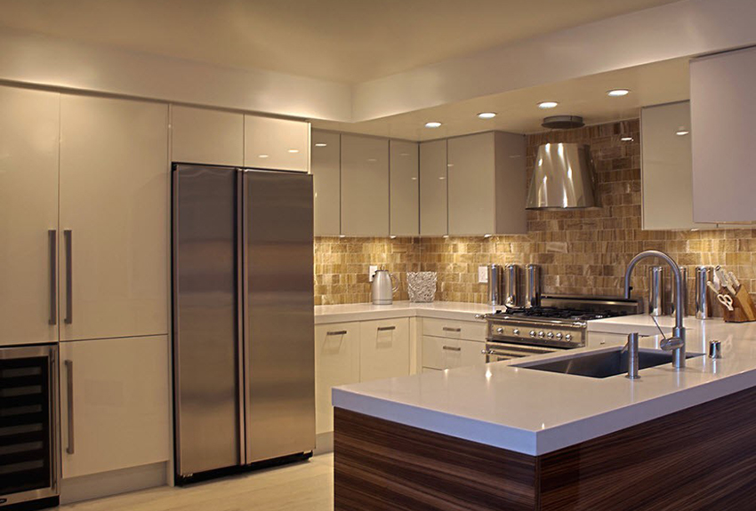 Køleskab. Denne fryser er et vigtigt element i ethvert køkken. De mest populære indbyggede køleskabe i dag er to-rum. Imidlertid er installation af en enhed med sådanne egenskaber ikke altid berettiget. For eksempel kan køleskabe med et rum med en fryser være velegnede til små familier. Om nødvendigt kan sidstnævnte installeres separat.
