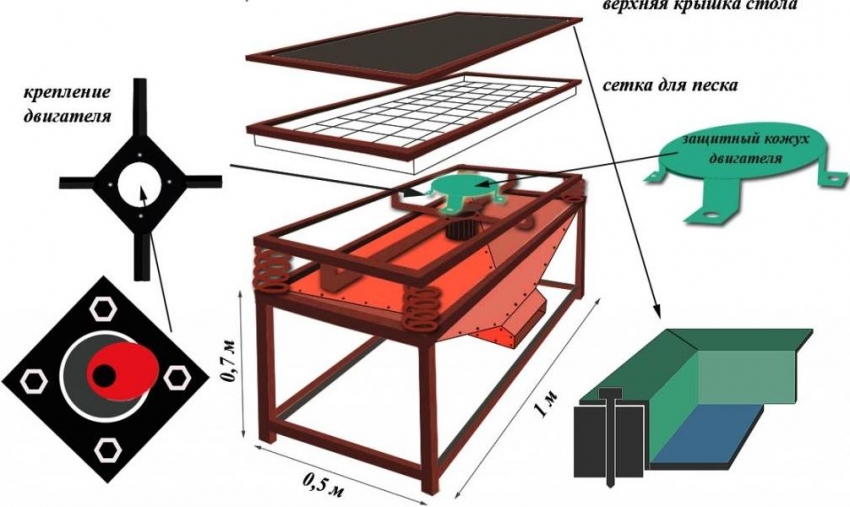 En generel idé om det vibrerende bordindretning kan opnås ved at læse skitsen. Men til den uafhængige fremstilling af en sådan struktur kræves en fuldgyldig tegning, der tager højde for alle nuancer og på forhånd angiver de krævede dimensioner for hvert af elementerne.