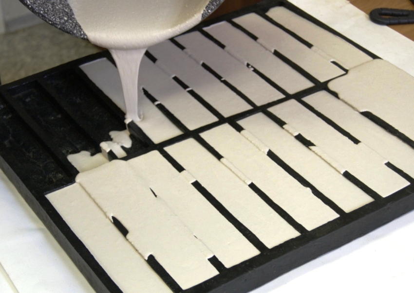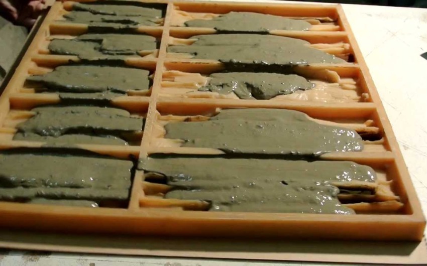 Efter tilsætning af den sidste komponent til blandingen fordeles den i form og udjævnes med en spatel. Teknologien til produktion af kunstig sten kan omfatte endnu et trin - vibrationsbehandling. Takket være dette øges ydeevneegenskaberne for den fremtidige flise betydeligt. Det er ønskeligt at udføre en sådan behandling umiddelbart efter anbringelse af blandingen i matrixen.