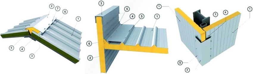 Sandwichplader installationsskema. Rygforbindelse (billede til venstre): 1 - sandwichpanel til tagdækning, 2 - rygprofil, 3 - rygforsegling, 4 - under rygprofil, 5 - monteringsskum eller mineraluld, 6 - panelfastgørelsesskrue, 7 - profilfastgørelsesskrue. Parapetforbindelse (billede i midten): 1 - sandwichpanel til tagdækning, 2 - sandwichpanel på væg, 3 - U-formet profil, 4 - anlægsprofil, 5 - profilfastgørelsesskrue, 6 - tætningsmiddel. Hjørnesamling (figur til højre): 1 - sandwich sandwichpanel, 2 - udvendig hjørneprofil, 3 - monteringsskum eller mineraluld, 4 - tætningsmiddel, 5 - selvskærende skrue til fastgørelse af profilen