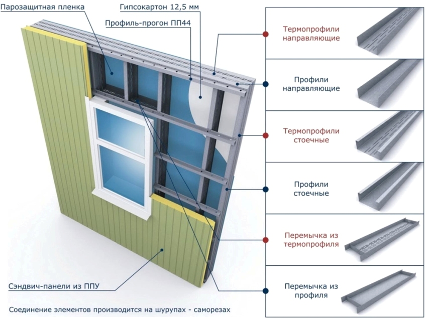 I det første tilfælde udføres installationen af bygningselementer på en metalramme. Vægplader bruges til at organisere den ydre kasse i huset såvel som de indre skillevægge. Tagdækning og vinduesmørbrød bruges også til installation af forskellige strukturer og adskiller sig fra vægmodeller i tekniske egenskaber og omkostninger.