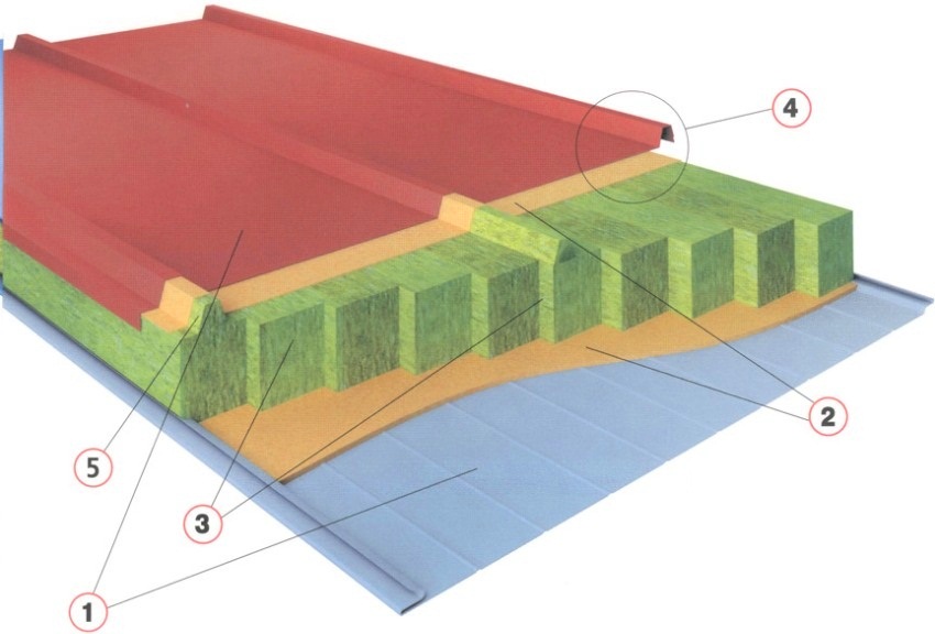 Tagsandwichpanelkonstruktion: 1 - galvaniseret stål med polymerbelægning, 2 - to-komponent polyurethanbaseret klæbemiddel, 3 - strukturelle mineraluldslameller baseret på basaltfiber, 4 - labyrintlåsfuger, 5 - trapezformet mineraluldslameller baseret på basaltfiber