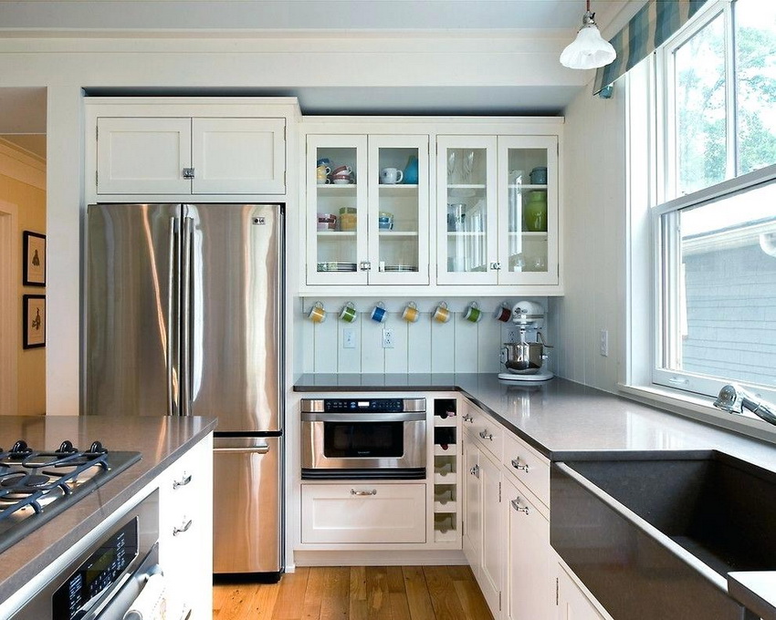 For lokaler med et begrænset areal (mindre end 6-7 m²) foretrækkes indbyggede husholdningsapparater. Ud over det faktum, at enhederne ikke optager plads på arbejdsfladen, er de også med succes skjult bag headsetfacaden. Det er godt, hvis køkkenet har multifunktionelle apparater, for eksempel en multikooker eller en fødevareprocessor. Der er således ikke behov for at købe ekstra fade og små husholdningsapparater.