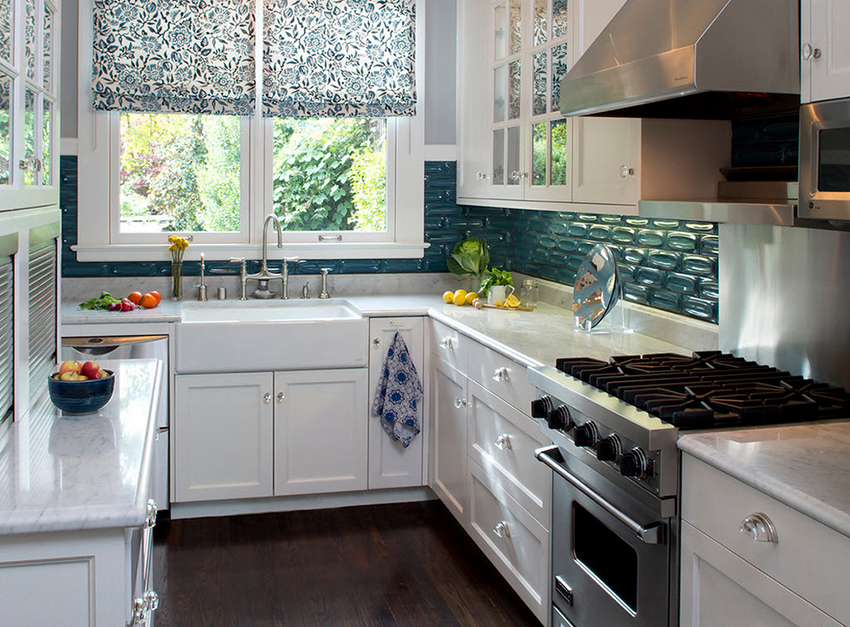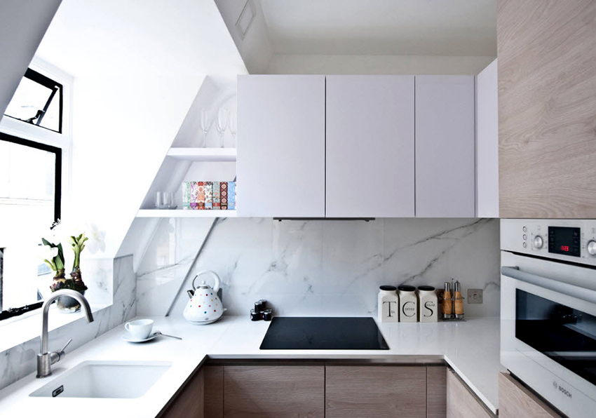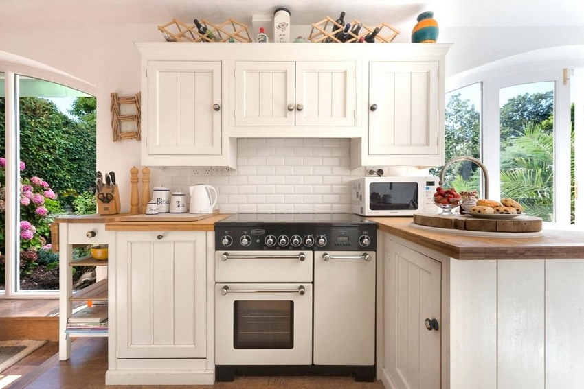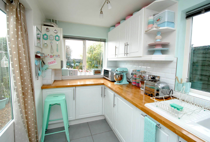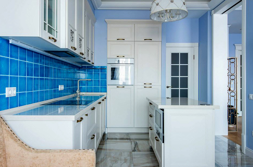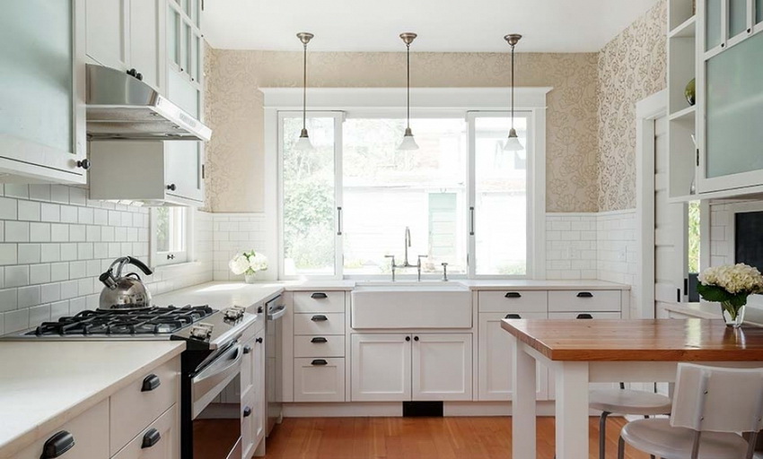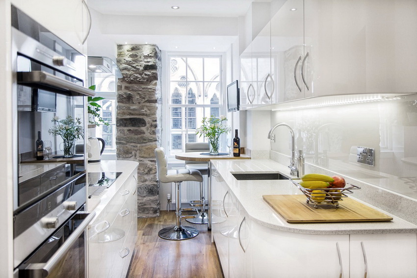 - Farveskema. På billedet af små køkkensæt findes der ofte lyse nuancer og hvidt. Den samme regel følges ved udsmykning af vægge, da et sådant farveskema visuelt udvider rummet.