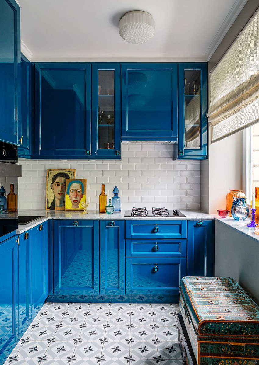 Lyse farver er mere typiske for Provence-stilarter, boho, fusion og loft. For ikke at gøre rummet for farverigt udføres lyse facader bedst på baggrund af monotone vægge i en kontrastfarve. Når du ser gennem et udvalg af fotos af køkkenfacader, kan du se, at grå, rød, blå, blå, gul og orange, lyserød betragtes som populære farver. Selv sort, hvis det bruges korrekt, kan dekorere et lille rum.
