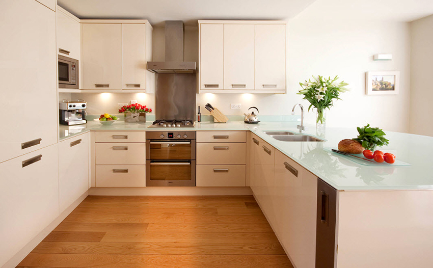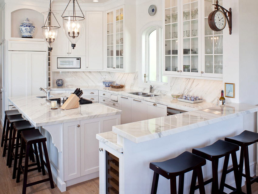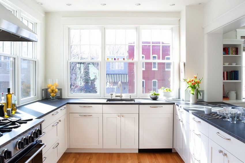 - U-formet. Optager plads langs tre vægge, mens du fanger to hjørner. Tidligere blev denne mulighed betragtet som egnet til store køkkener. Men selv i et lille køkken kan du placere bordpladen og synke mod vinduet og bringe skrivebordet til vinduet og bruge vindueskarmen til at øge det. U-formede køkkener suppleres ofte med en lille bardisk.