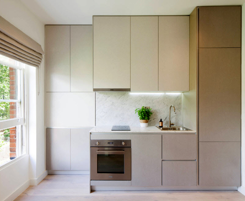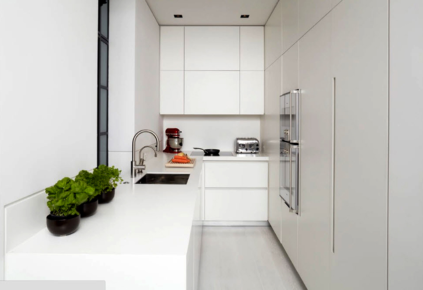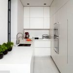 Hvis rummets form kun tillader det hjørne køkken, derefter bliver arbejdsområdet som regel til et rektangel, som også betragtes som den bedste mulighed i et begrænset område. Lige køkkensæt i et lineært lille køkken gør arbejdsområdet til et spidsvinklet rektangel, hvilket gør rummet ikke-funktionelt og ubehageligt. Derfor betragtes denne mulighed i små rum ikke som acceptabel.