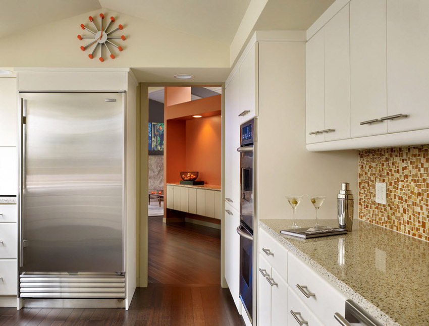 Hi-tech og techno stilarter bruger en kombination af blanke facader og mat overflader. Hvid eller sølv husholdningsapparater passer let ind i sådanne interiører.