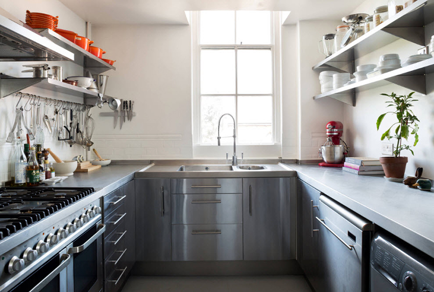 Når man ser på billederne af køkkensæt, kan man se, at hylderne i skabene i nogle tilfælde er åbne. Men designere anbefaler stadig ikke at gøre dette i et trangt rum.