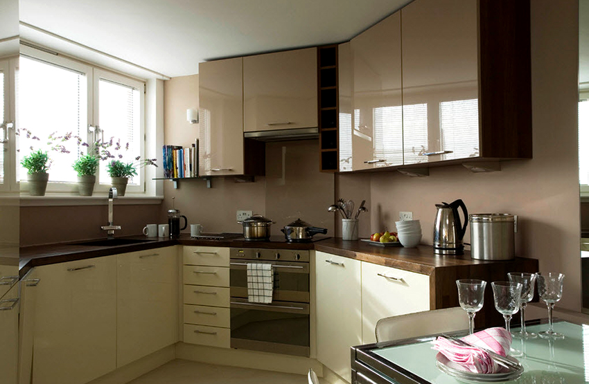 - Materiale. I et lille køkken vil et blankt køkkensæt lavet af plast eller MDF af høj kvalitet se godt ud. En reflekterende overflade tilføjer volumen til rummet og gør rummet visuelt større.