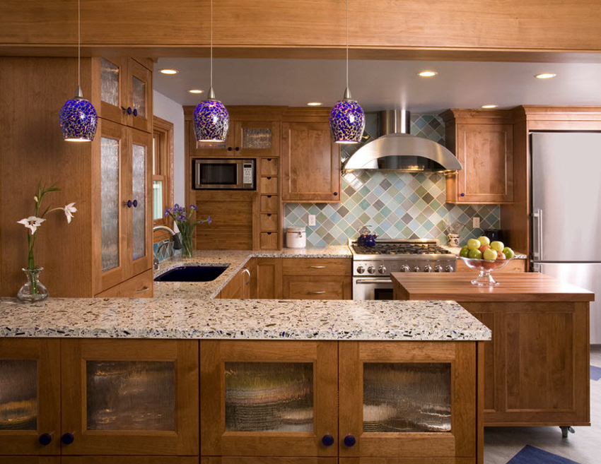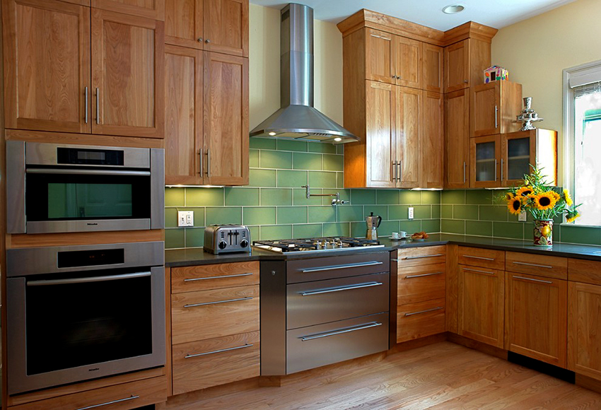 - træ. Det betragtes som det dyreste materiale til fremstilling af køkkenmøbler. Hvis du bruger kropsdele eller facader af naturligt massivt træ, skal du sørge for, at de er forbehandlet med beskyttelsesmidler og antiseptiske midler. De krævede arter er eg, birk, gran, fyr;
