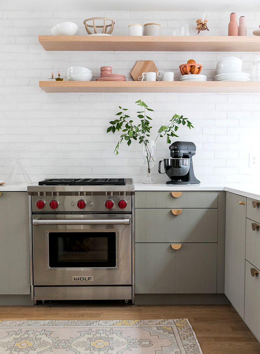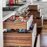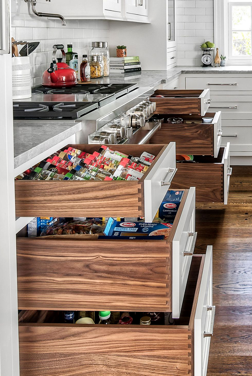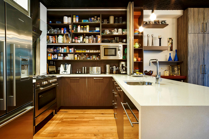 På åbne hylder er der ingen måde at installere moderne glidebeslag, som giver dig mulighed for at placere flere fade, mad og andet køkkenudstyr. Skufferne er mere rummelige. Der bruges også forskellige containere, net og kurve, som gør det muligt at optimere opbevaringen af køkkenredskaber.