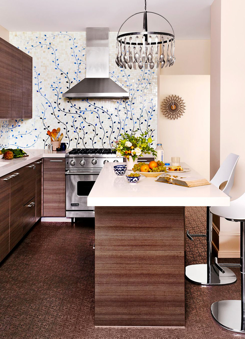 Farverne og designretningen vælges under hensyntagen til personlige ønsker, formen på køkkenet og funktionerne i vægdekorationen. Lyse farver betragtes som de mest succesrige, når man udsmykker et rum.