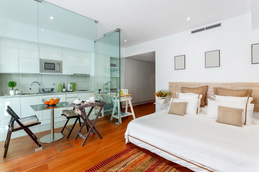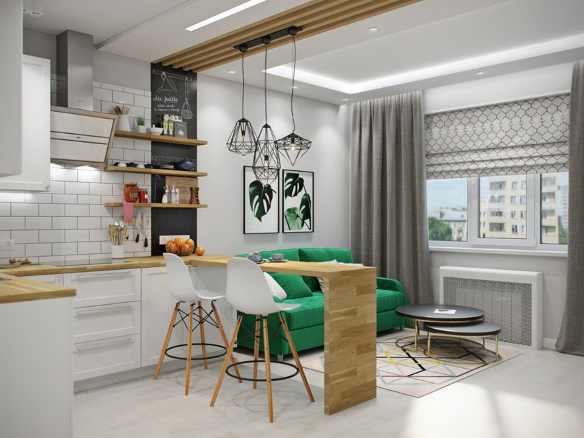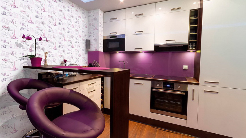 Som regel er små køkkener i små et-værelses lejligheder, i dette tilfælde er en åben plan den bedste mulighed.