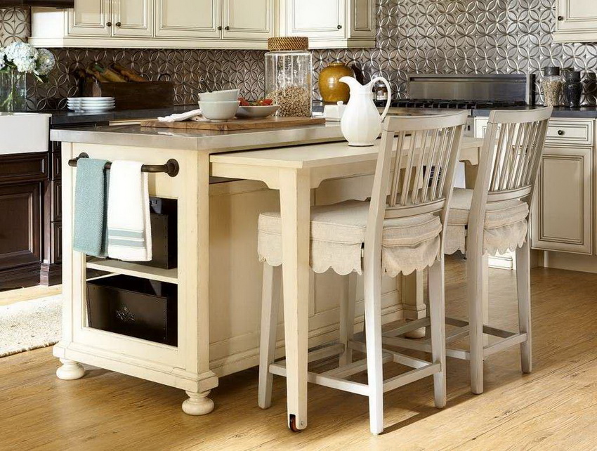 Et mobilbord med hjul er især nyttigt til små studiolejligheder. Dette design kombinerer spisestue og arbejdsområder. Om nødvendigt kan produktet let fjernes, drejes eller flyttes til det ønskede sted. Køkkenet med et udtræksbord ser moderne, funktionelt og stilfuldt ud.