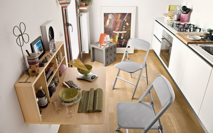 En meget god mulighed for et lille køkken er borde og stole i en størrelse, der giver dig mulighed for at fjerne stole under bordpladen. I dette tilfælde vil der være plads til manøvrer, hvis møblerne ikke bruges til det tilsigtede formål.