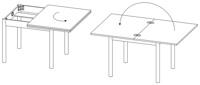 Transformationen af bordet kan bestå af foldbare, glidende og fastgjorte dele. Bordpladen kan forstørres fra den ene eller begge sider. Størrelsen på foldeelementerne afhænger af behovet. Forskellige former gør det muligt at montere et foldbart køkkenbord til et lille køkken i ethvert interiør.