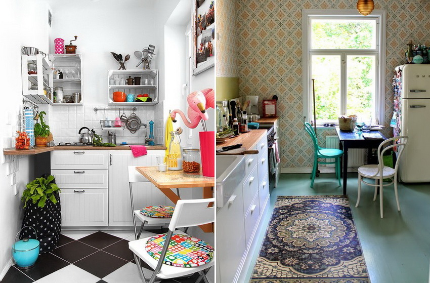 En masse ting skal passe i køkkenet: komfur, skabe, køleskab, skuffer til små redskaber. Der er lidt plads tilbage til bordpladsen. Hvis det ikke er muligt at placere et stort bord, kommer originale ideer til placeringen af kompakte modeller til undsætning.