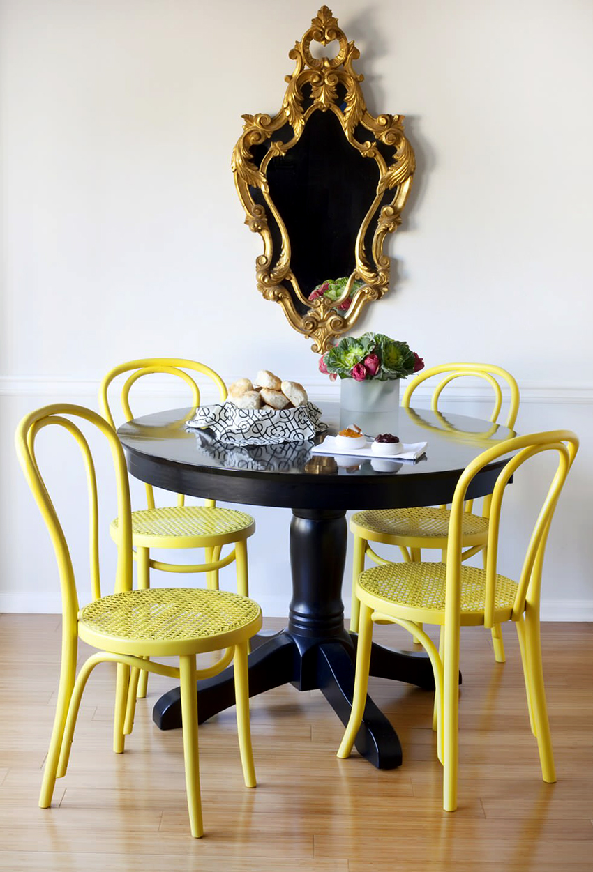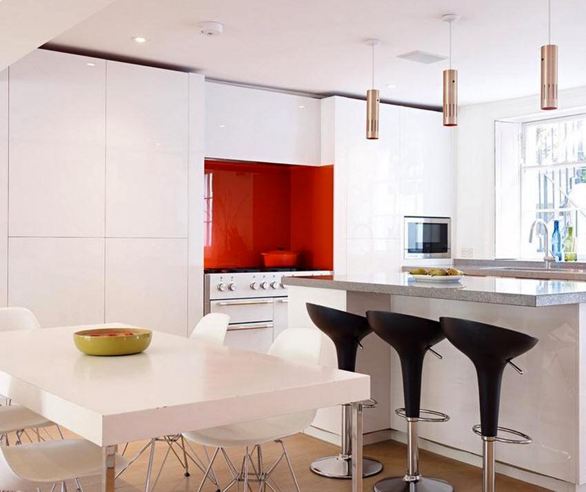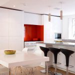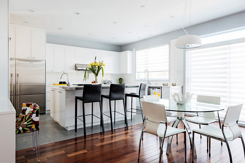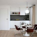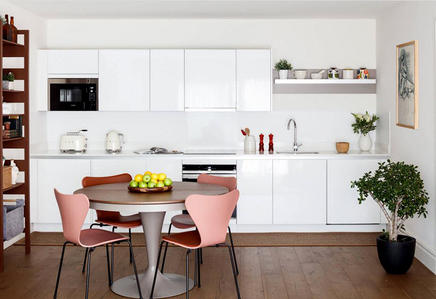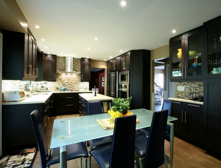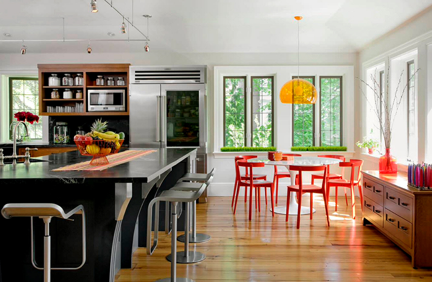 Hjælpsomme råd! Skræddersyede borde og stole til køkkenet vil dominere det samlede interiør, så de kan have en original form og kontrasterende farver (i forhold til resten af designet). For eksempel vil en sort, rød eller orange spisegruppe se godt ud på en grundlæggende hvid baggrund.