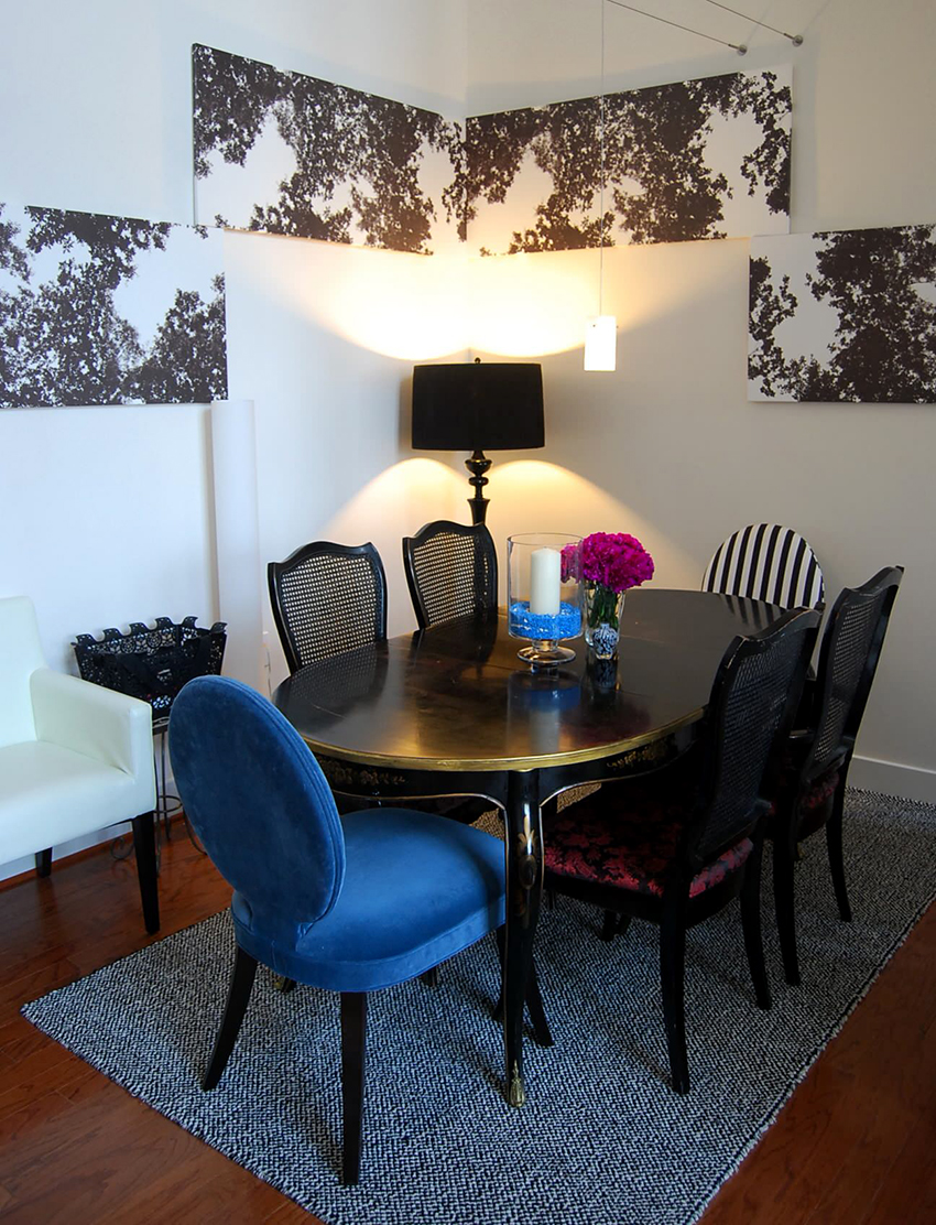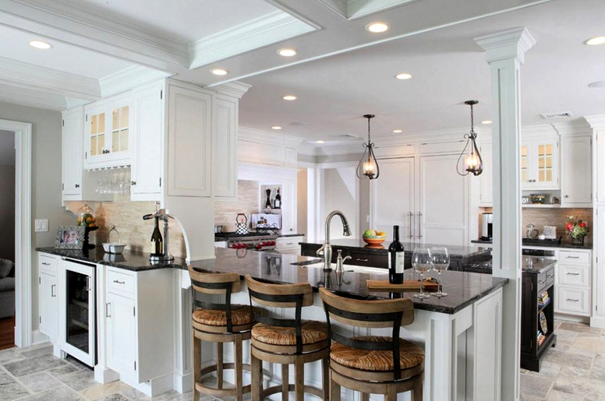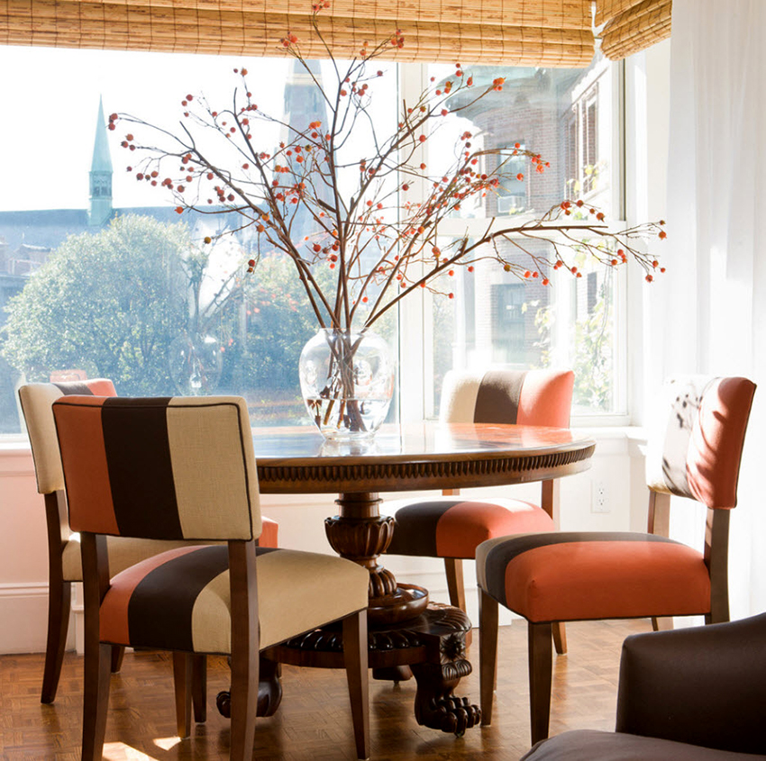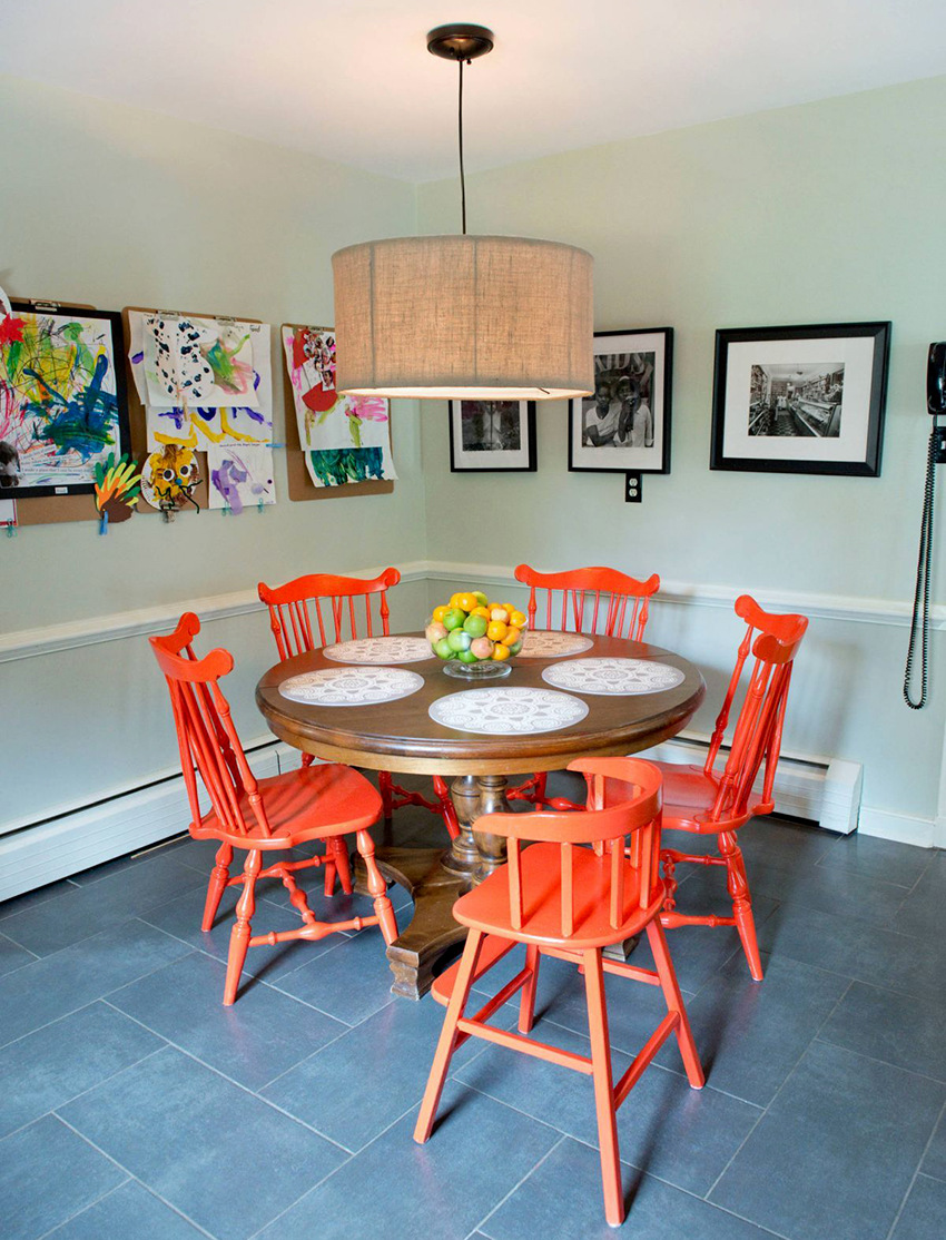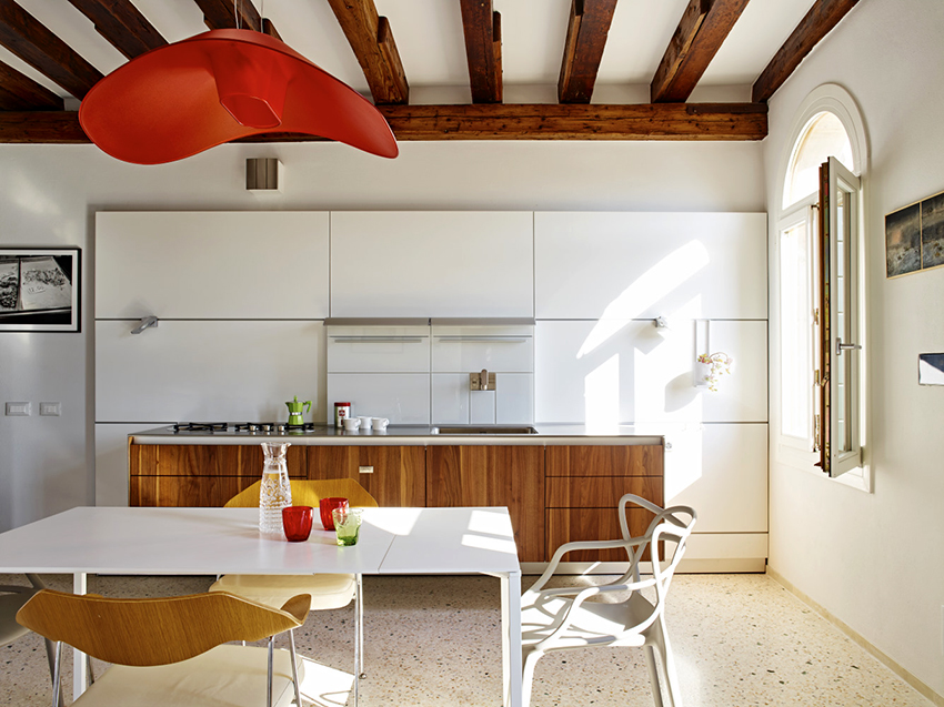 Hjælpsomme råd! Skræddersyede borde og stole til køkkenet vil dominere det samlede interiør, så de kan have en original form og kontrasterende farver (i forhold til resten af designet). For eksempel vil en sort, rød eller orange spisegruppe se godt ud på en grundlæggende hvid baggrund.