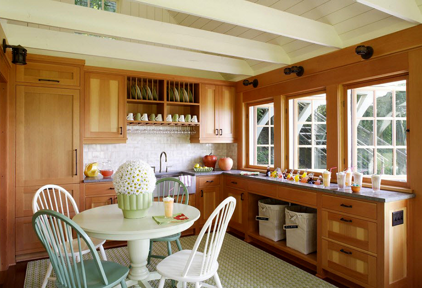 Bordernes farver skal vælges under hensyntagen til køkkenets stil. Farven på produkter lavet af naturligt træ har en naturlig tone af træ, som sammen med strukturen bestemmer det dekorative design af alle køkkenmøbler. Borde og stole lavet af træ er passende i forskellige stilarter. Massive produkter ser smukke ud i et klassisk design, design i enkle former passer perfekt ind i land, Provence eller loft.