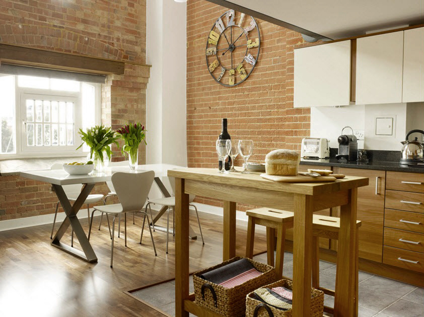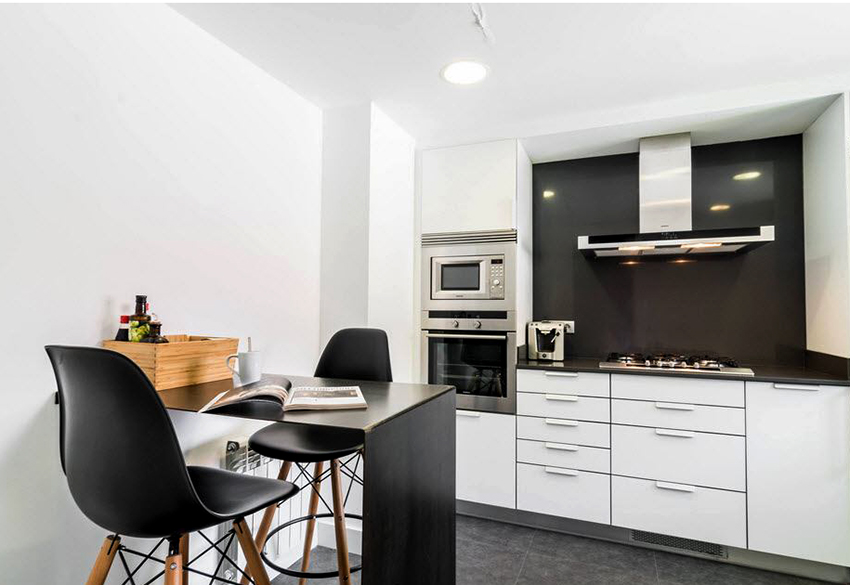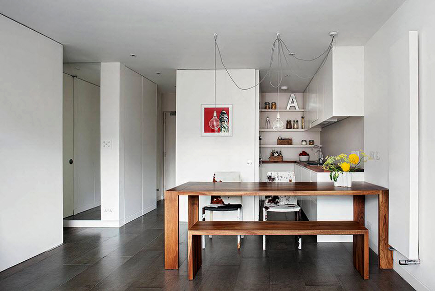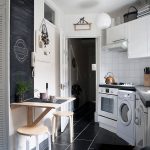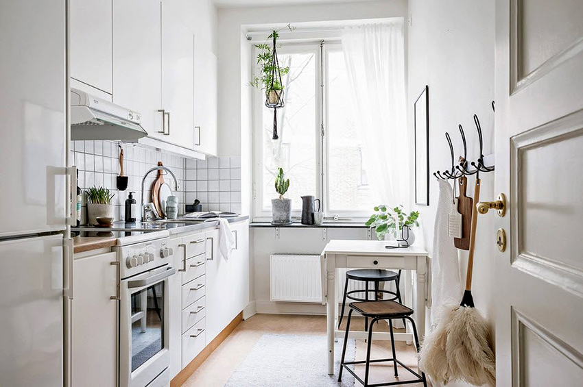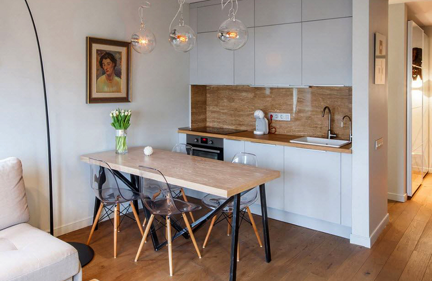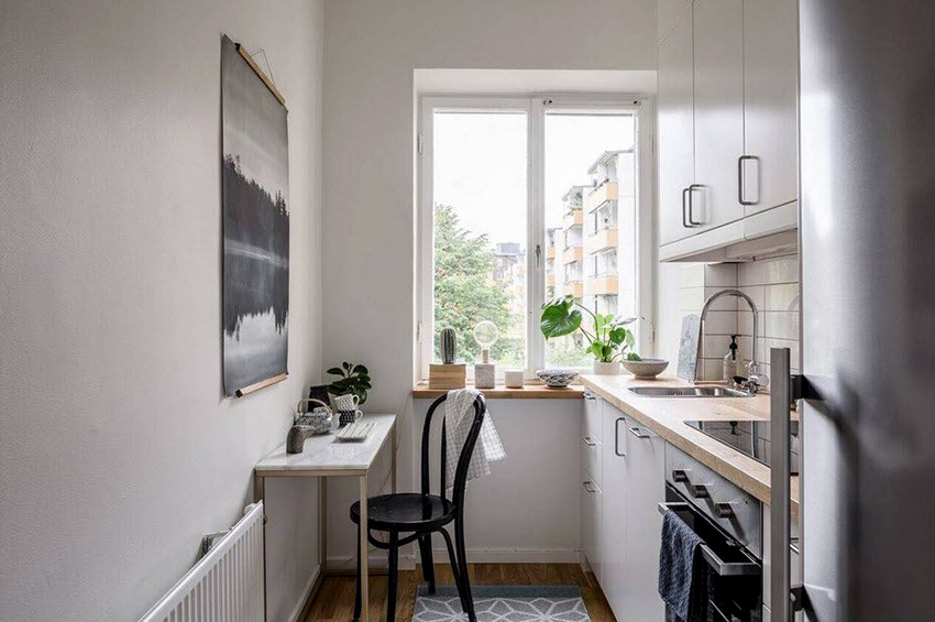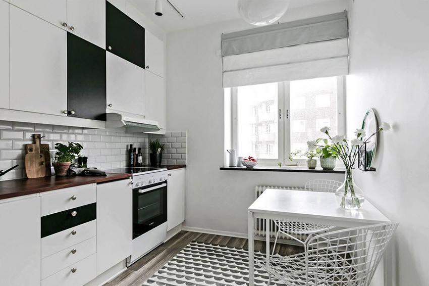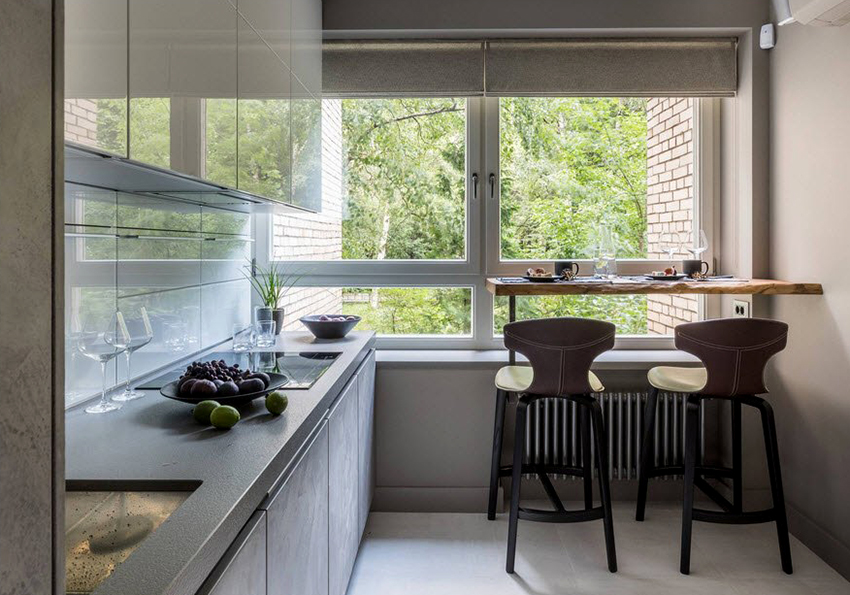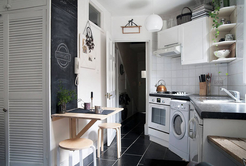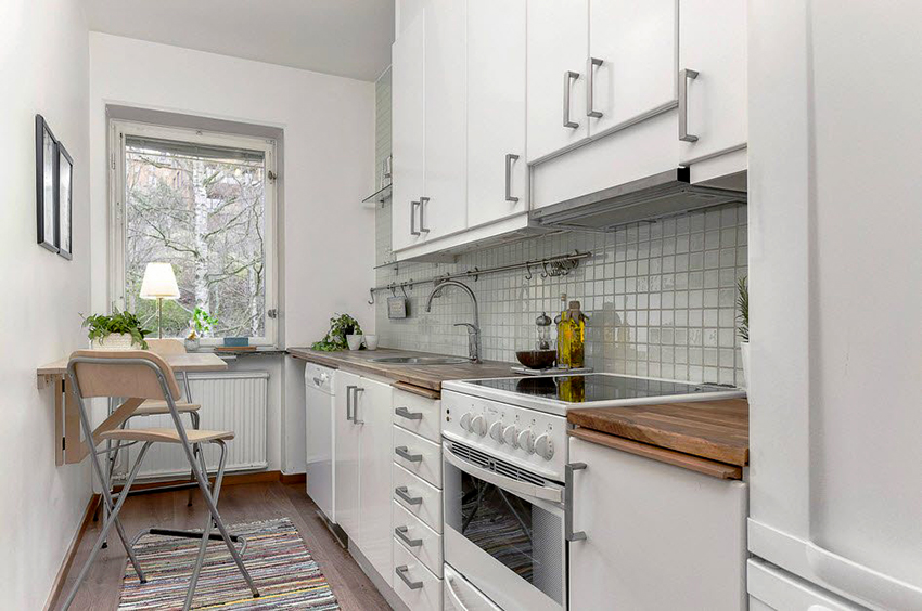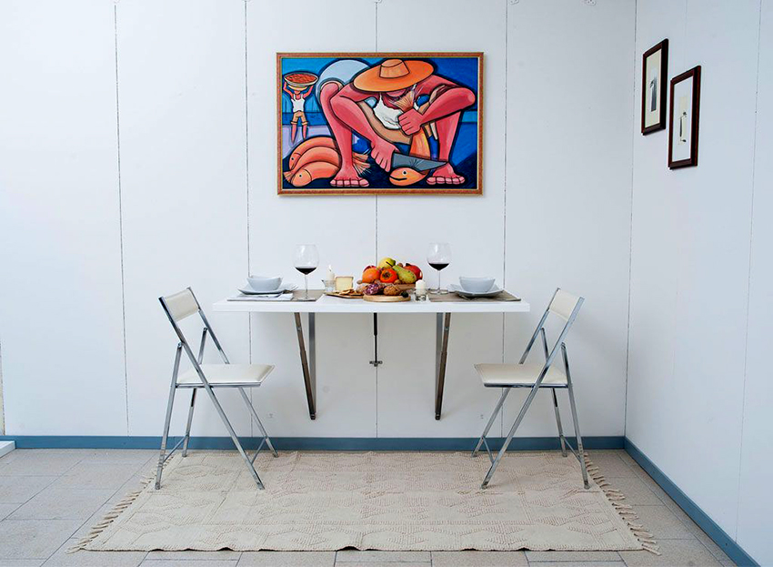 Foldestrukturer har som regel to ulemper - de er tunge og ikke særlig attraktive, når de foldes. Selv små, men stationære borde ser mere æstetisk og naturlige ud i køkkenet. Fotos viser tydeligt dette.