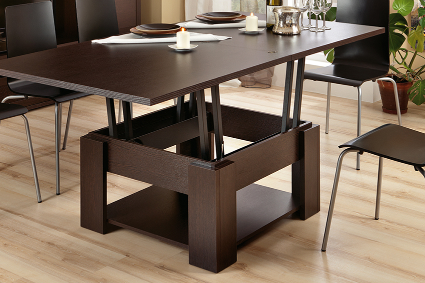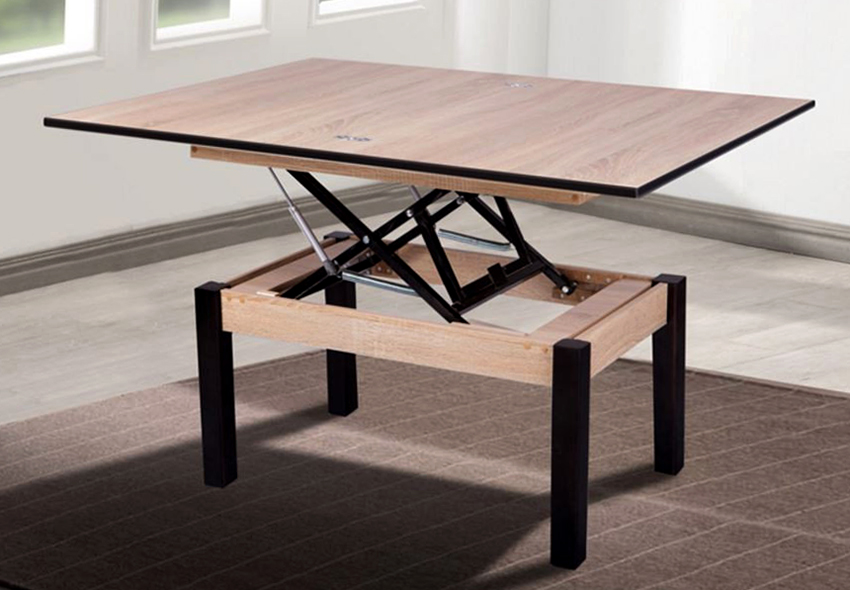 Den bedste måde at omdanne et sofabord til et spisebord er at omdanne produktet ved at løfte bordpladen. Således tager strukturen højden af et konventionelt spisebord.Udstyret med en glidemekanisme hjælper med at øge bordoverfladen. Dette fordobler effektivt miniaturebordet (i højde og længde).