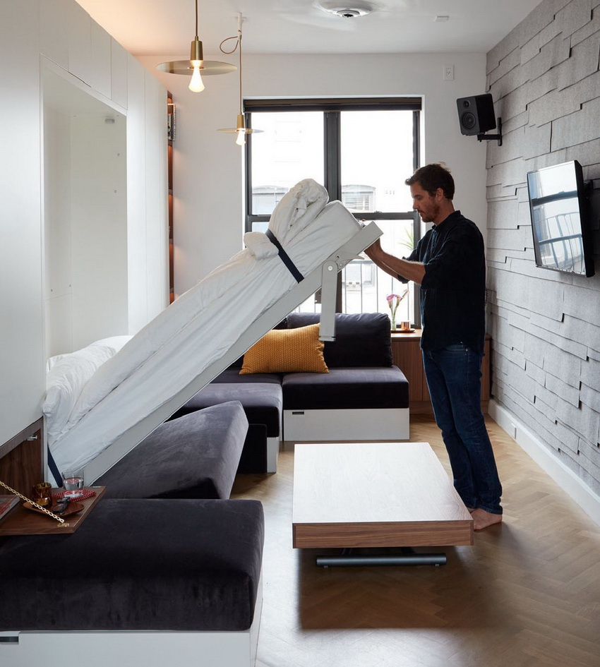 Kombinerede senge indbygget i et klædeskab med en sofa, drejelige foldbare produkter